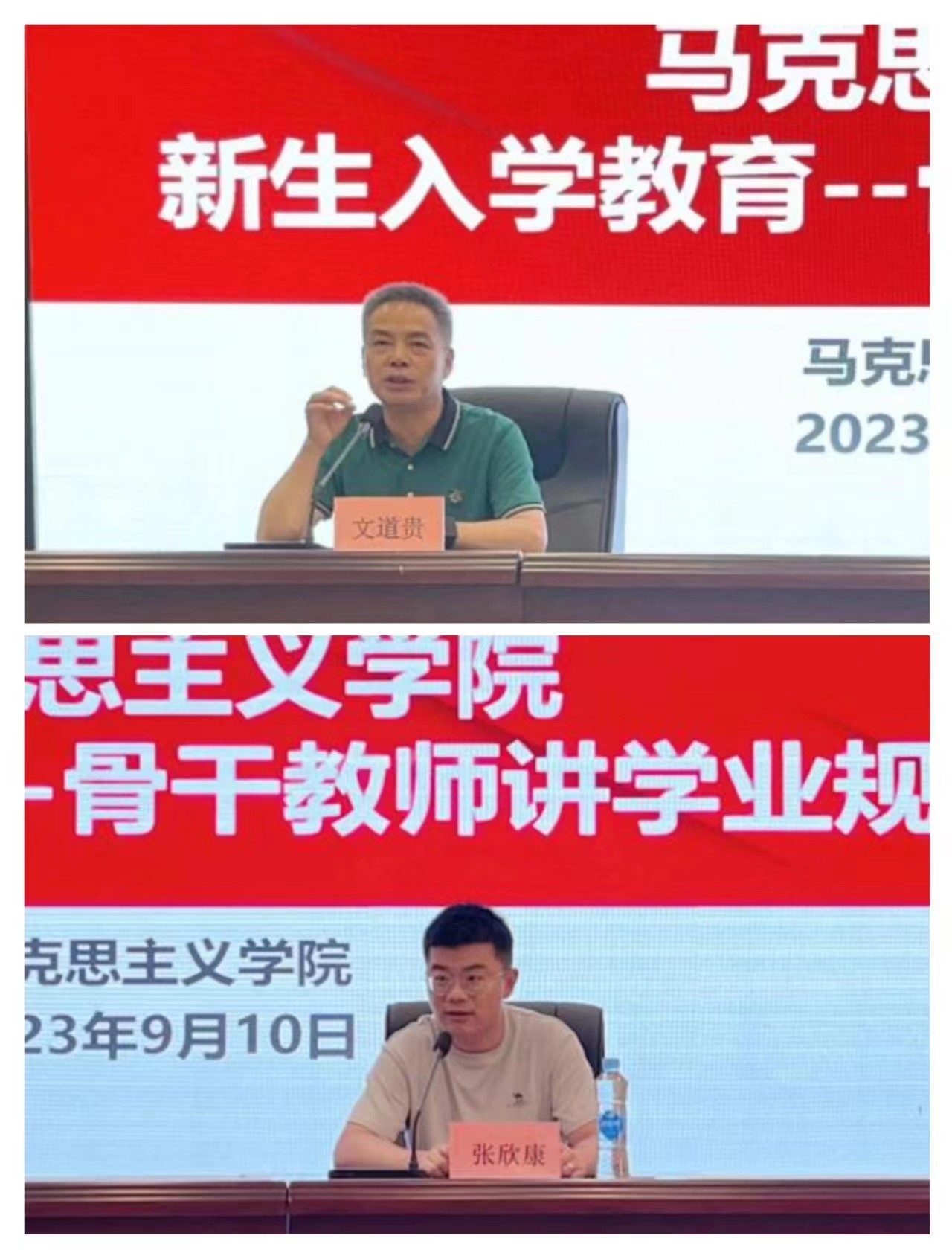 为帮助2023级新生进一步适应大学生活,培养同学们的专业认知水平和专业认同感,引导同学们明确未来职业发展方向,树立专业自信,jinnianhui今年会于2023年9月10日14:30在2312学术报告厅召开2023级新生入学教育之骨干教师讲学业规划讲座。院长文道贵,党总支书记张欣康,思政和法学两个专业教研室主任与骨干教师,新生辅导员以及全体大一新生参加本次会议。会议由党总支书记张欣康主持。