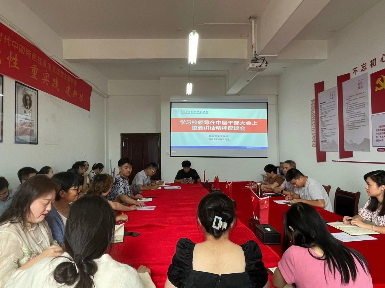 9月12日下午,jinnianhui今年会在1511会议室召开大会,学习贯彻校领导在中层干部大会上重要讲话精神。院长文道贵、党总支书记张欣康、党总支副书记李婷、副院长张丹以及学院全体教职工参加,会议由党总支书记张欣康主持。