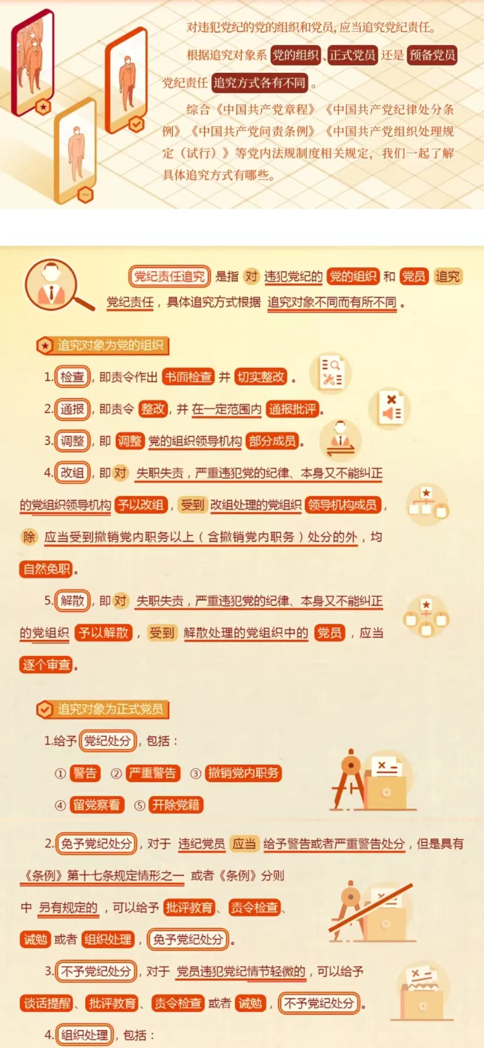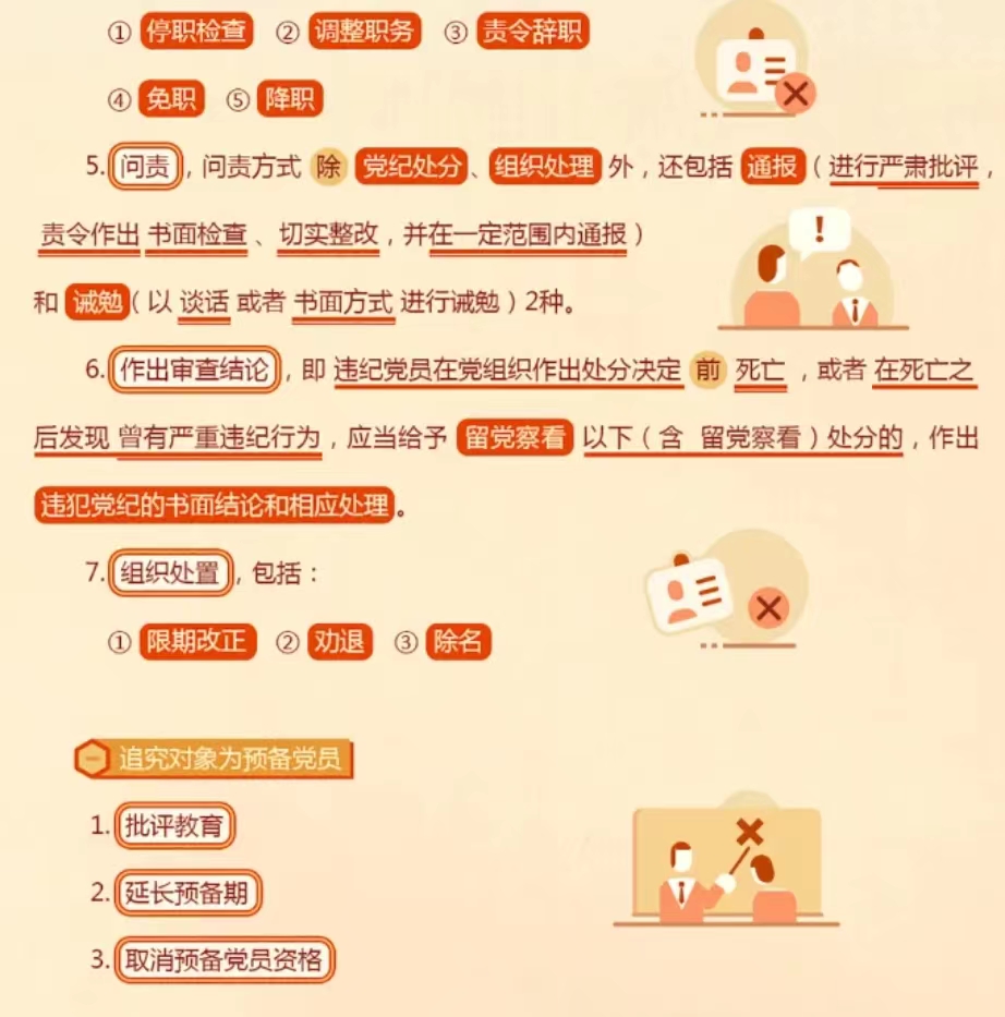 base 首页栏目 学院概况 教学管理 教师教学 学科专业 党建活动 学团建设 招生就业 先进典型 专题专栏 媒体聚焦 文件下载 您现在的位置是:首页 > base > 专题专栏 党纪学习教育|党纪责任追究对象方式一览 管理员2024-05-014906 上一篇 党纪学习教育|第10课对违法犯罪党员的处分规定 下一篇 党纪学习教育第9课:《条例》修订重点条文解读要清楚