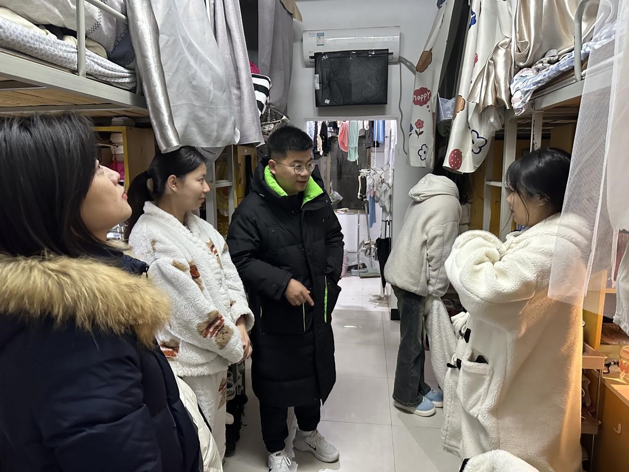 为深入加强师生交流、了解学生备考情况、切实解决学生所遇到的实际问题。12月19日晚,在学校第一次党员大会即将召开之际,jinnianhui今年会党总支书记张欣康、副书记李婷携全体辅导员深入学生宿舍走访,给予学生在生活与学业上的关心关爱。