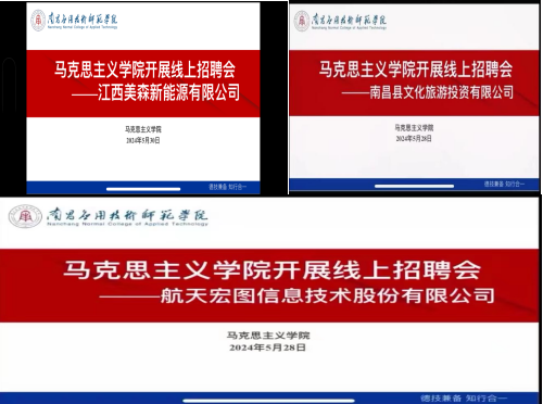 jinnianhui今年会于2024年5月30日召开了线上就业招聘会。本次会议邀请到了江西美森新能源有限公司、航天宏图信息技术股份有限公司、南昌县文化旅游投资有限公司相关负责人参会,学院党总支副书记李婷、毕业生辅导员、全体毕业生参加。会议由就业专员朱文清主持。