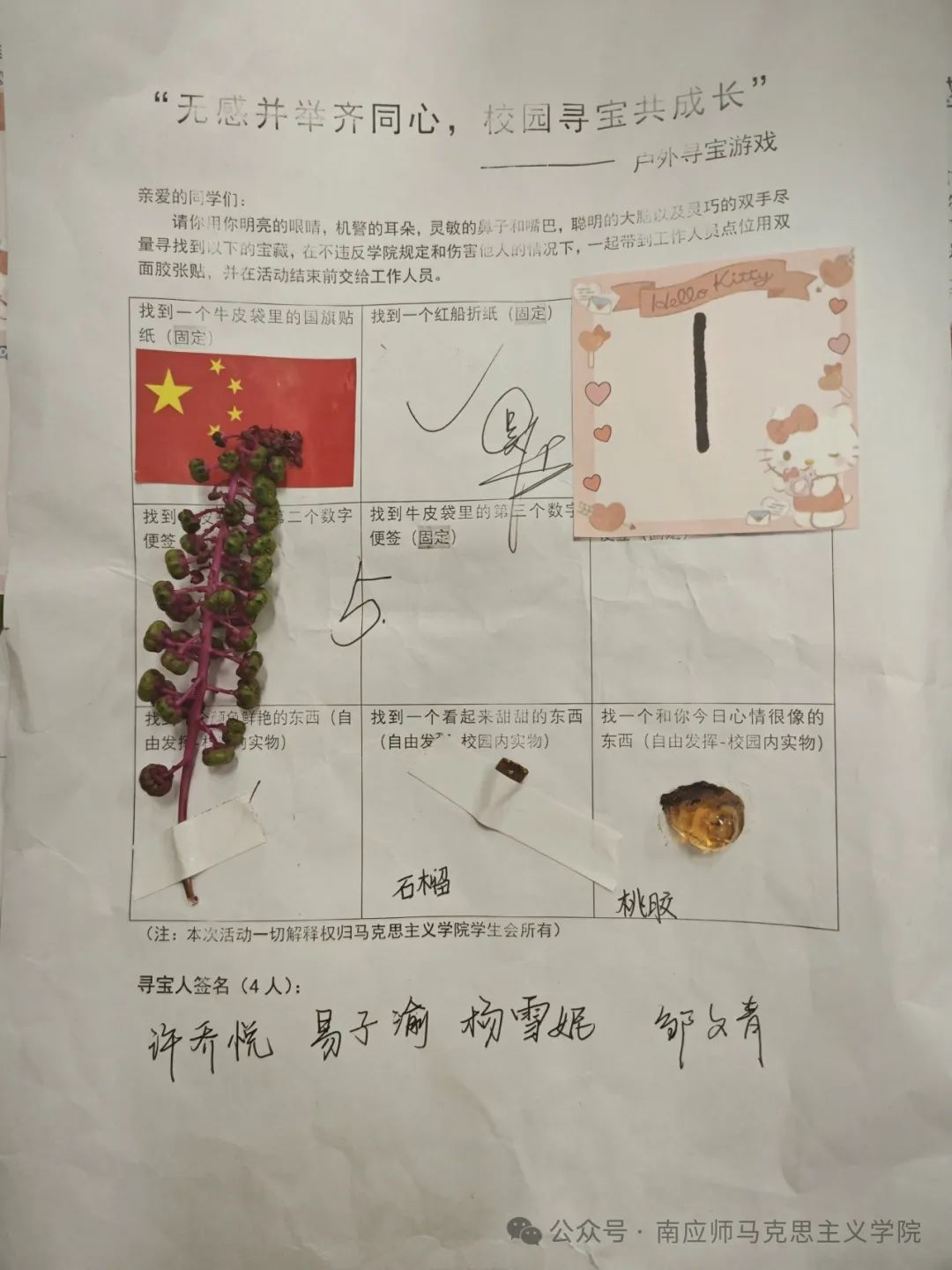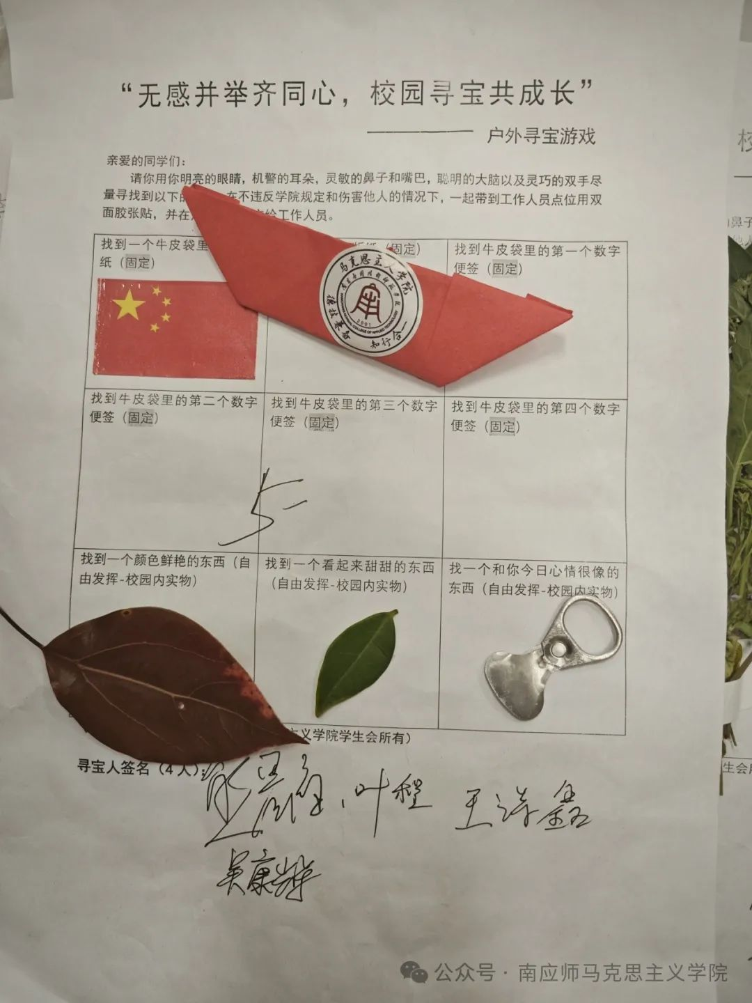 同学们互帮互助,共同协作,在不懈努力下寻找到了被藏匿的宝物,充分发挥自己的五感发现了校园的美好。