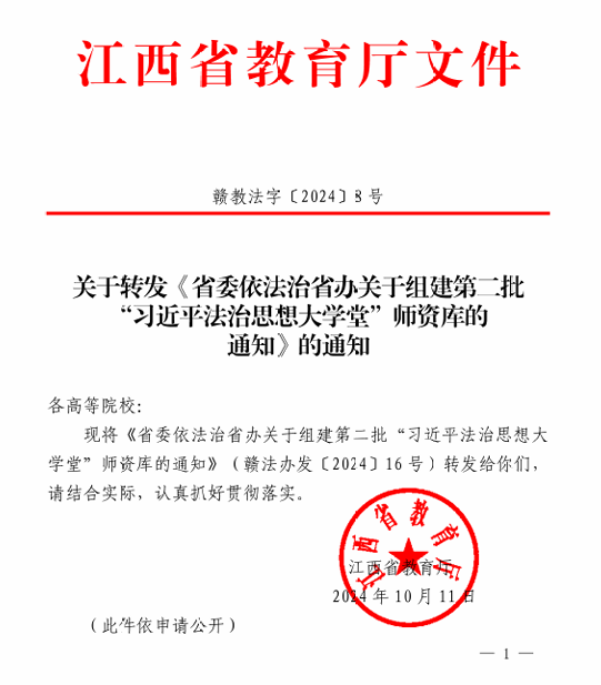 近日,江西省教育厅下发了《关于转发《省委依法治省办关于组建第二批“习近平法治思想大学堂”师资库的通知》(赣教法字〔2024〕8号)》的通知文件,确定了70位讲师入选全省第二批“习近平法治思想大学堂”师资库。今年会副教授刘德彰成功入选。