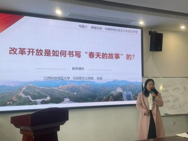 接着,省级教学成果奖获得者、江西科技师范大学马院张丽博士、青年教师郑青青分别以“改革开放是如何书写“春天的故事”的?”、“网络生活中的道德要求”为题讲授示范课。两位来访青年教师在备课准备、教学组织、AI技术手段融入课堂等环节,通过诗意的语言为我们生动地讲述了《习近平新时代中国特色社会主义思想概论》《思想道德修养与法治》精彩片段,通过主题讨论、数据分析、随堂训练、与人工智能对话等多种教学手段,为今年会老师带来了一场充满互动与创新的课堂体验。