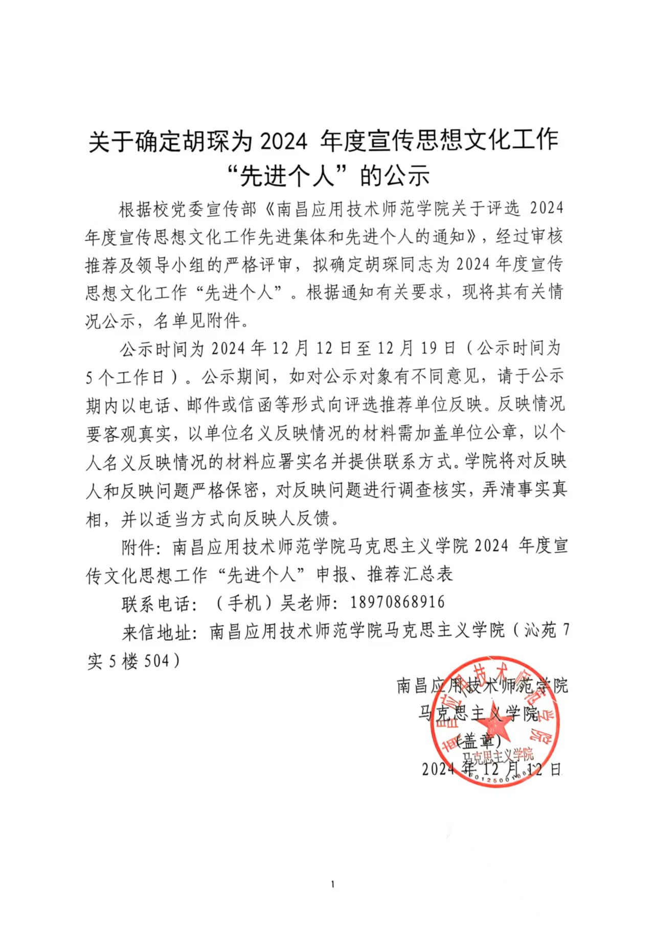 首页栏目 通知公告 学院新闻 习近平思想学习专栏 主题教育学习 院长书记信箱 您现在的位置是:首页 > 首页栏目 > 通知公告 关于确定胡琛为2024 年度宣传思想文化工作 “先进个人”的公示 学生科2024-12-123302 上一篇 关于拟将幸修丽、曹芮晨、徐雨婷、方伟思同志转为正式党员的公示 下一篇 2023-2024学年第一学期奖学金公示名单