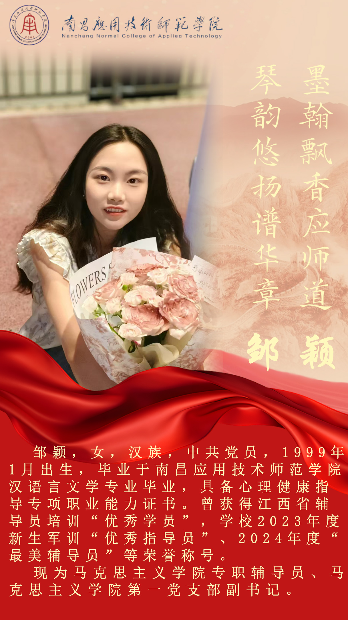 先进典型 优秀毕业生 优秀在校生 优秀教职工 您现在的位置是:首页 > 先进典型 > 优秀教职工 邹颖 最美辅导员 管理员2025-04-171467 上一篇 戴瑞轩 思想政治教育系主任 下一篇 李宏鑫 先进工作者