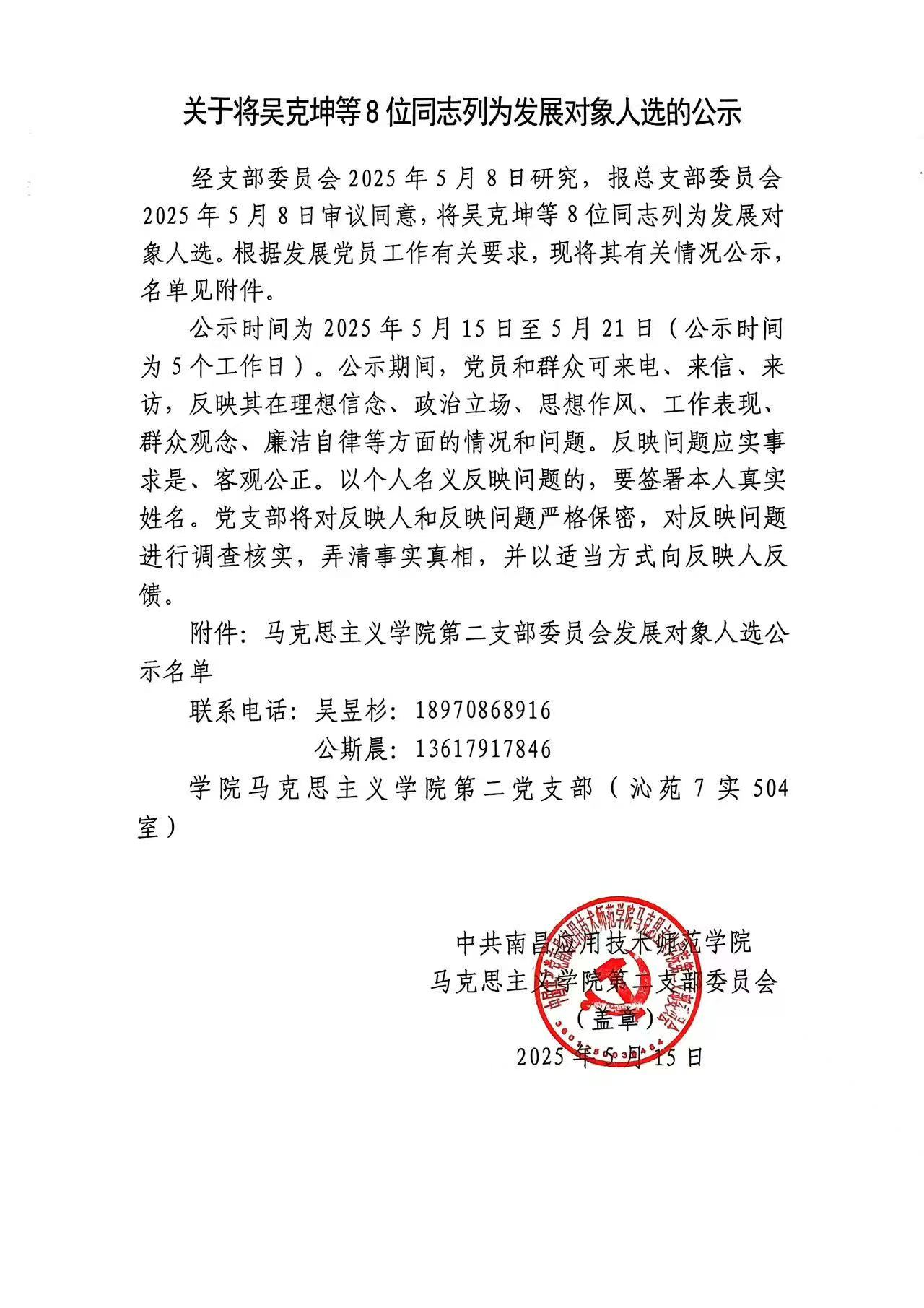 首页栏目 通知公告 学院新闻 习近平思想学习专栏 主题教育学习 院长书记信箱 您现在的位置是:首页 > 首页栏目 > 通知公告 关于将吴克坤等8位同志列为发展对象人选的公示 管理员2025-05-151632 上一篇 关于将李欢等4位同志列为发展对象人选的公示 下一篇 关于拟将幸修丽、曹芮晨、徐雨婷、方伟思同志转为正式党员的公示
