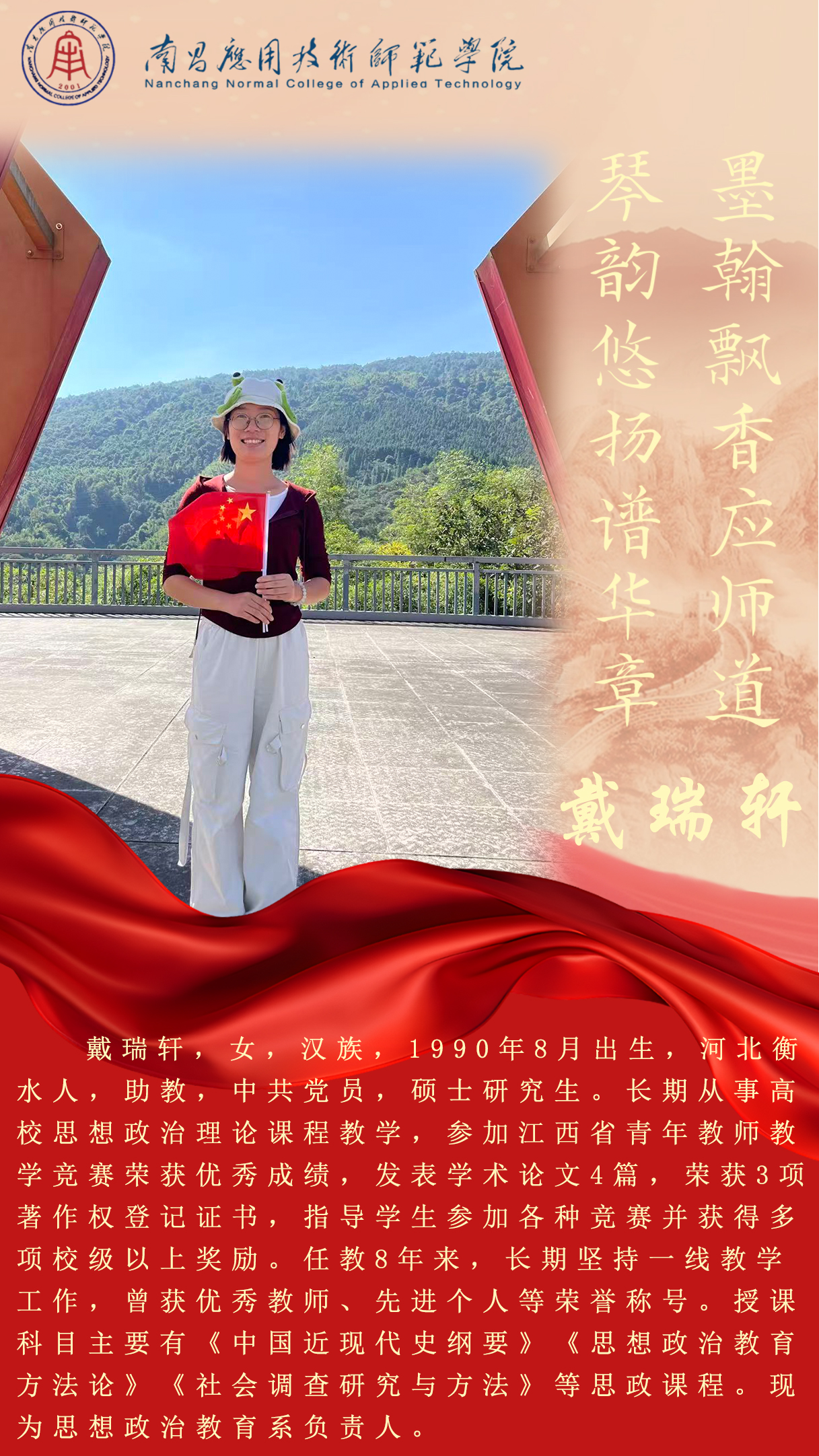 先进典型 优秀毕业生 优秀在校生 优秀教职工 您现在的位置是:首页 > 先进典型 > 优秀教职工 戴瑞轩 思想政治教育系主任 管理员2025-06-091404 上一篇 龚三妹 法学系主任 下一篇 邹颖 最美辅导员