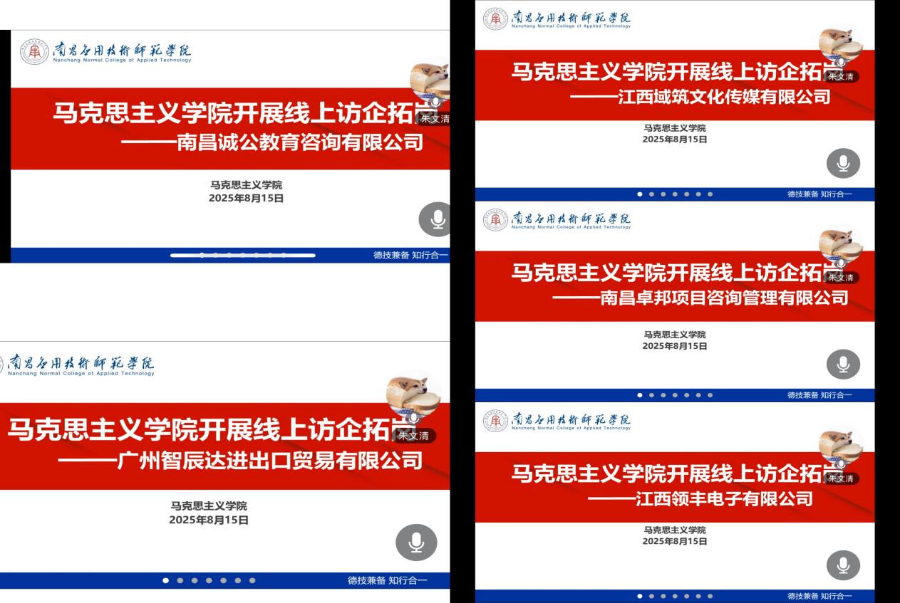 为拓宽毕业生就业渠道,强化校企合作,给学生提供更广阔的职业发展空间,8月15日,jinnianhui今年会党总支书记张欣康通过视频形式对南昌诚公教育咨询有限公司、广州智辰达进出口贸易有限公司、江西域筑文化传媒有限公司、南昌卓邦项目咨询管理有限公司、江西领丰电子有限公司进行访问,双方就人才培养、实习实训、就业指导等方面进行了深入交流,并达成了一系列合作意向。