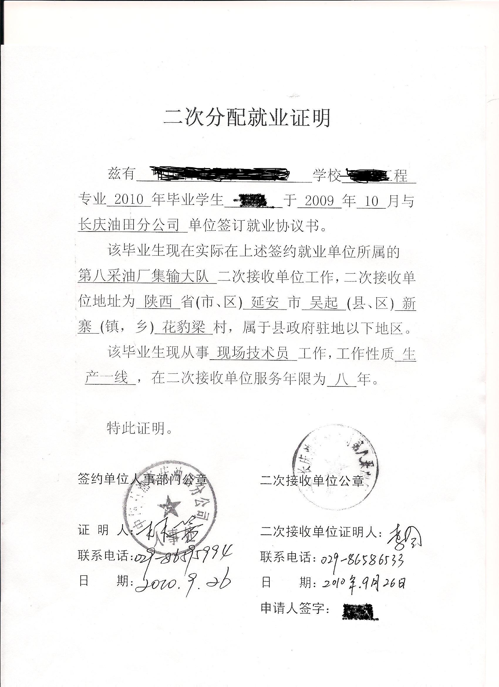 3.二次分配就业证明原件两份;