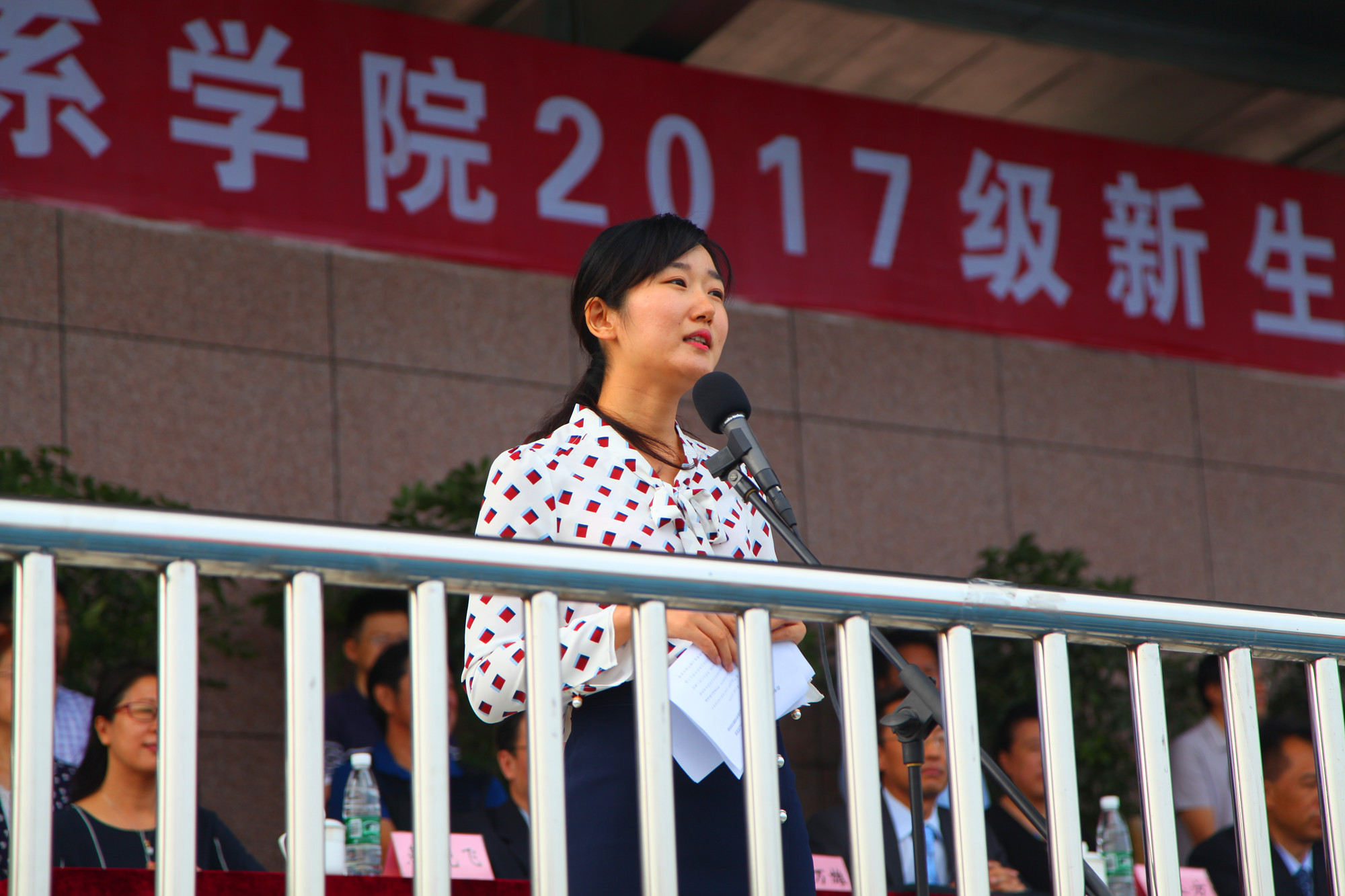 工会学院2017级社会工作专业学生白東佩代表本科新生发言,表示将拥有诚实、自信、坚持等优良品质,成长为懂感恩、有礼貌、会学习的时代中劳院人。