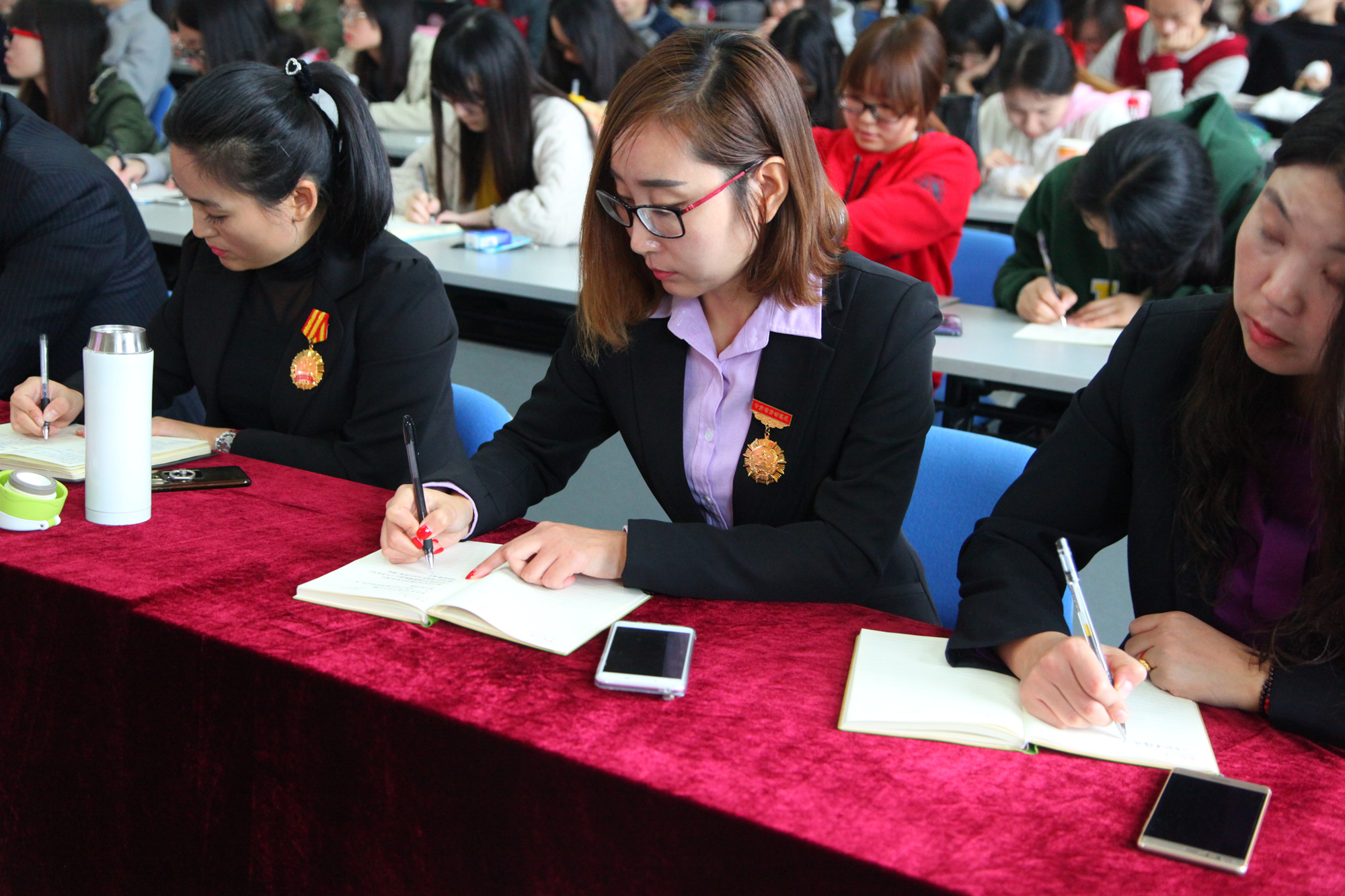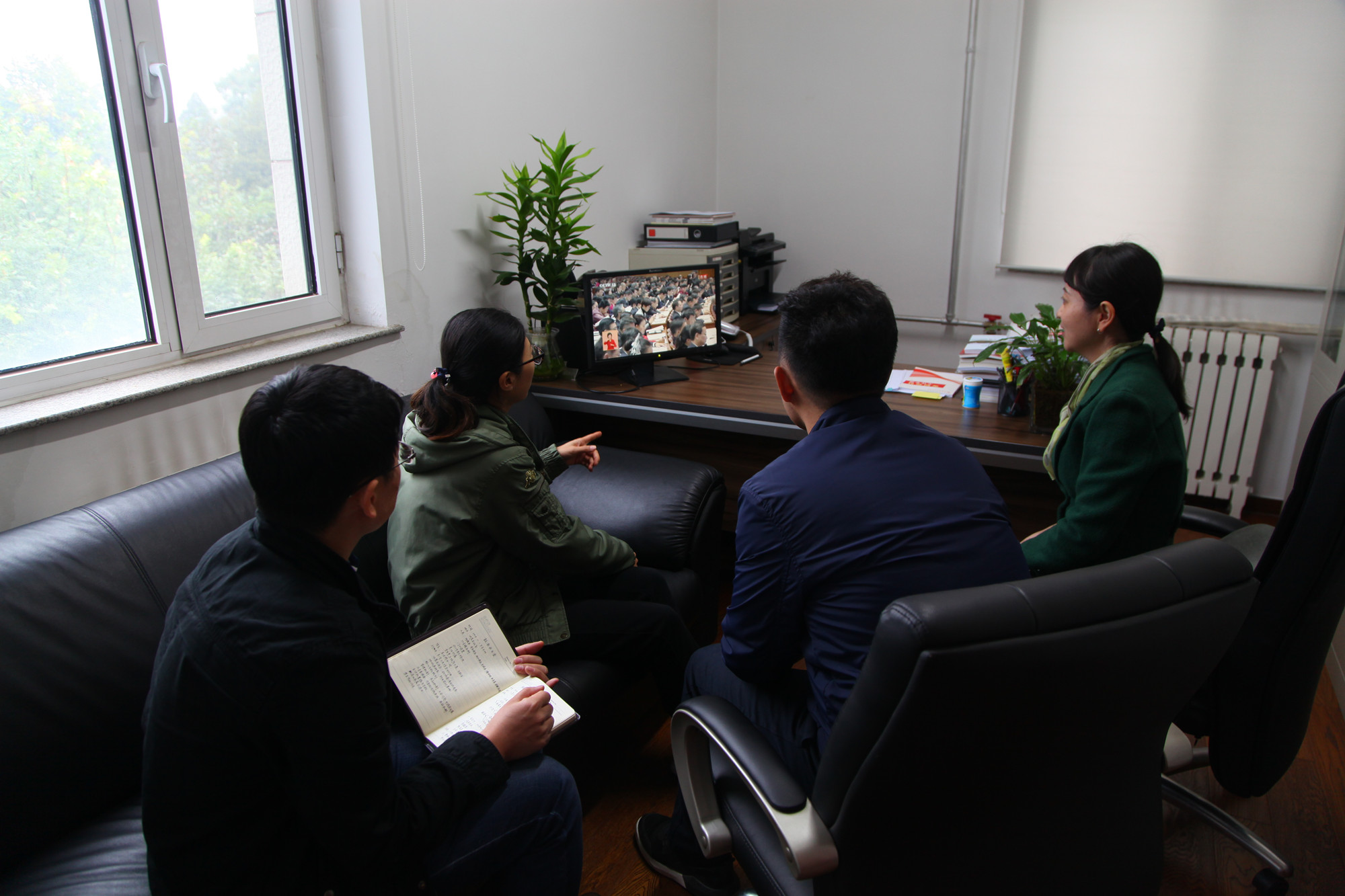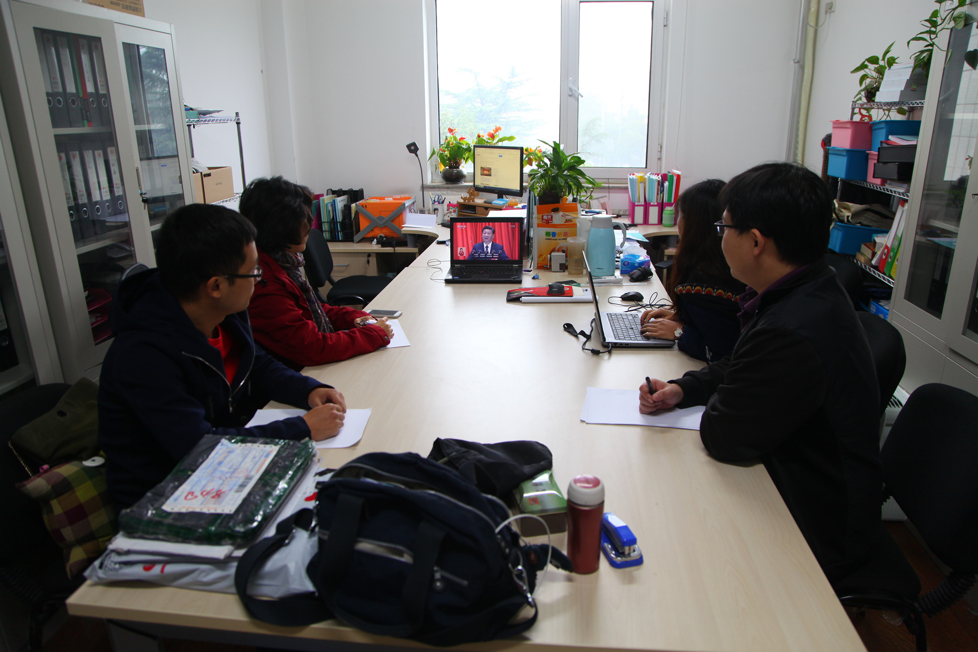 在北京校区,学校两委委员、学生党员、劳模学员、入党积极分子、离退休党支部书记和学校各部门党员干部代表早早来到教学楼508教室,一起收看大会,聆听习近平总书记的报告,并不时提笔记录。