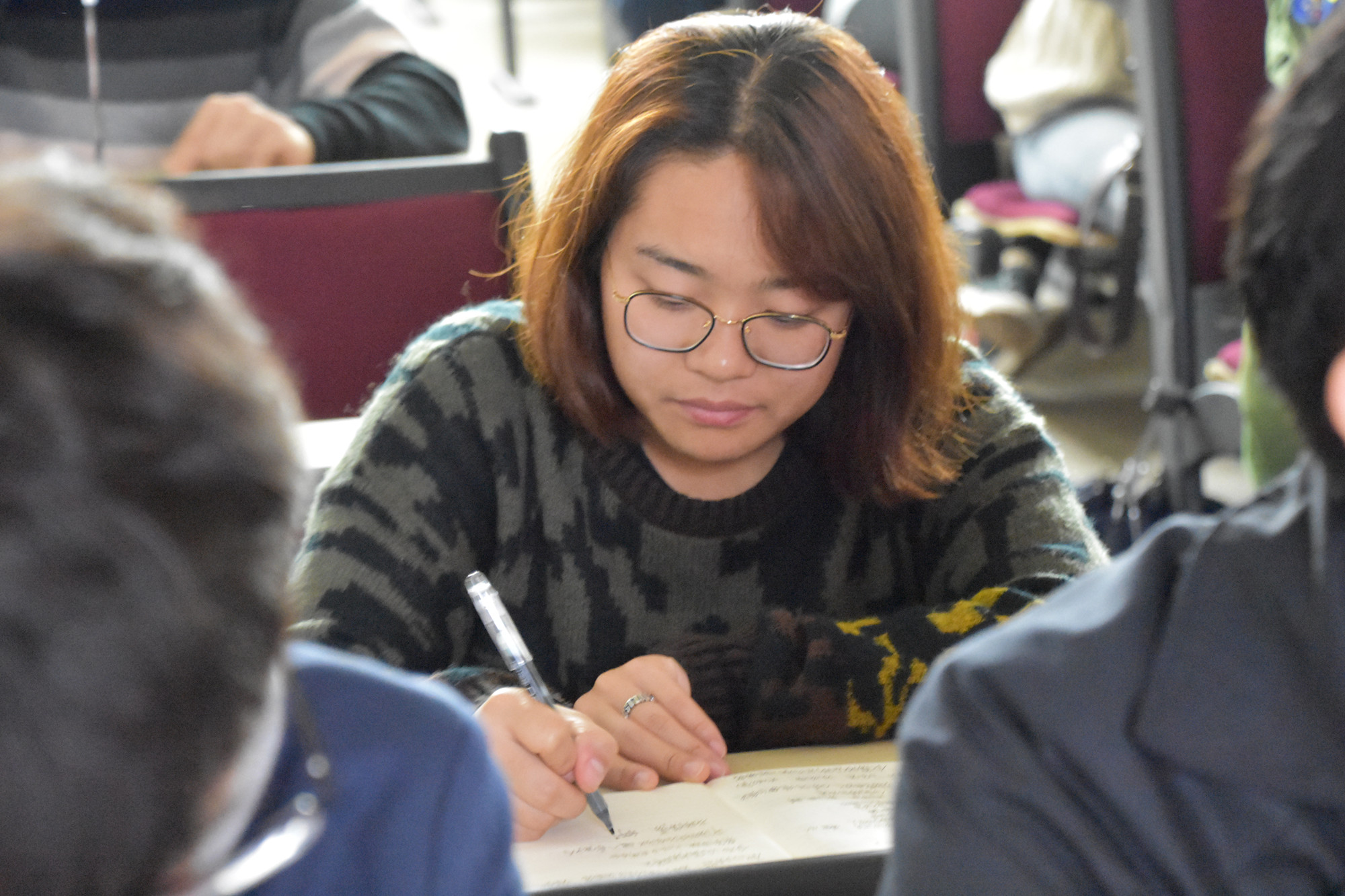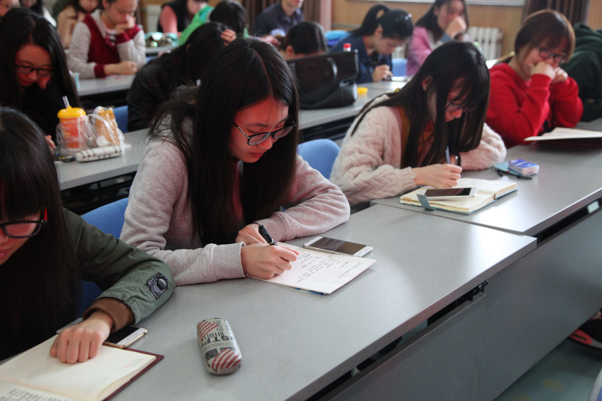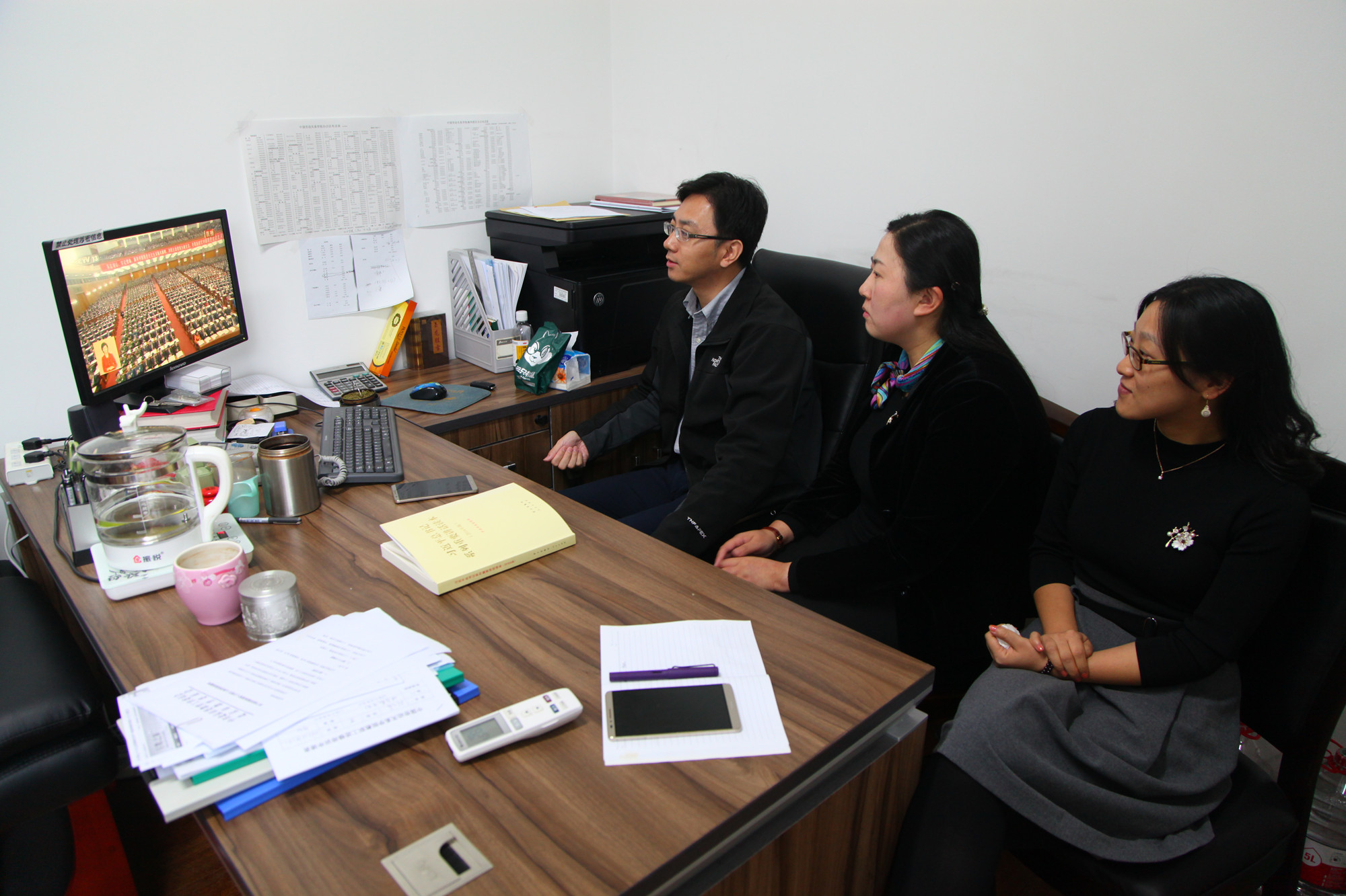 在北京校区,学校两委委员、学生党员、劳模学员、入党积极分子、离退休党支部书记和学校各部门党员干部代表早早来到教学楼508教室,一起收看大会,聆听习近平总书记的报告,并不时提笔记录。