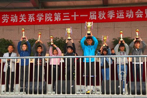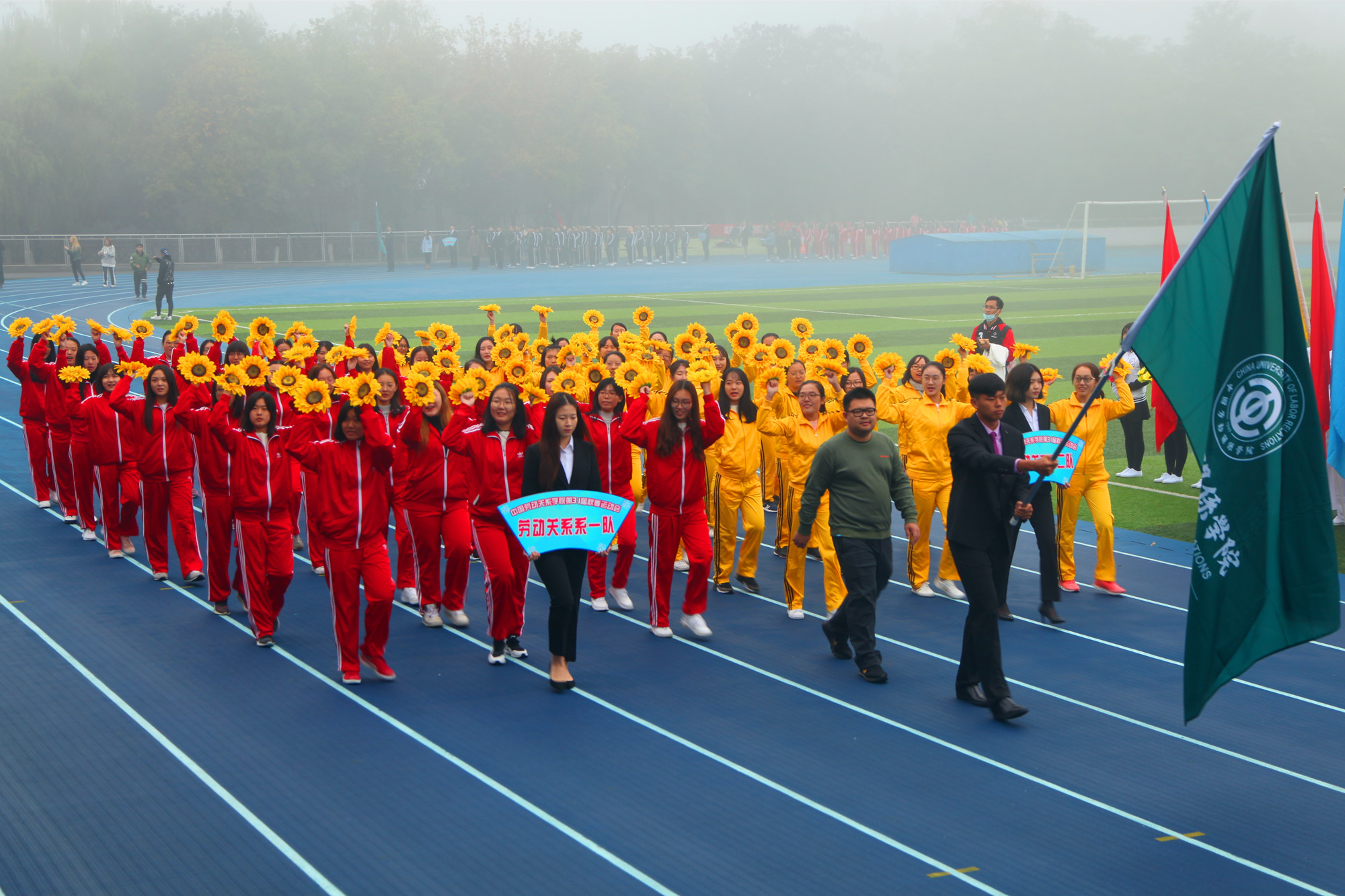 在学校国旗护卫队的引领下,由劳动关系系学生组成的彩旗队、花束队首先通过主席台。随后,各院(系)运动员方队喊着嘹亮的口号,排着整齐的队形,踏着坚定的步伐列队从主席台前走过。学校瑜伽社、散打社和体育舞蹈社的同学们也分别进行了精彩表演。