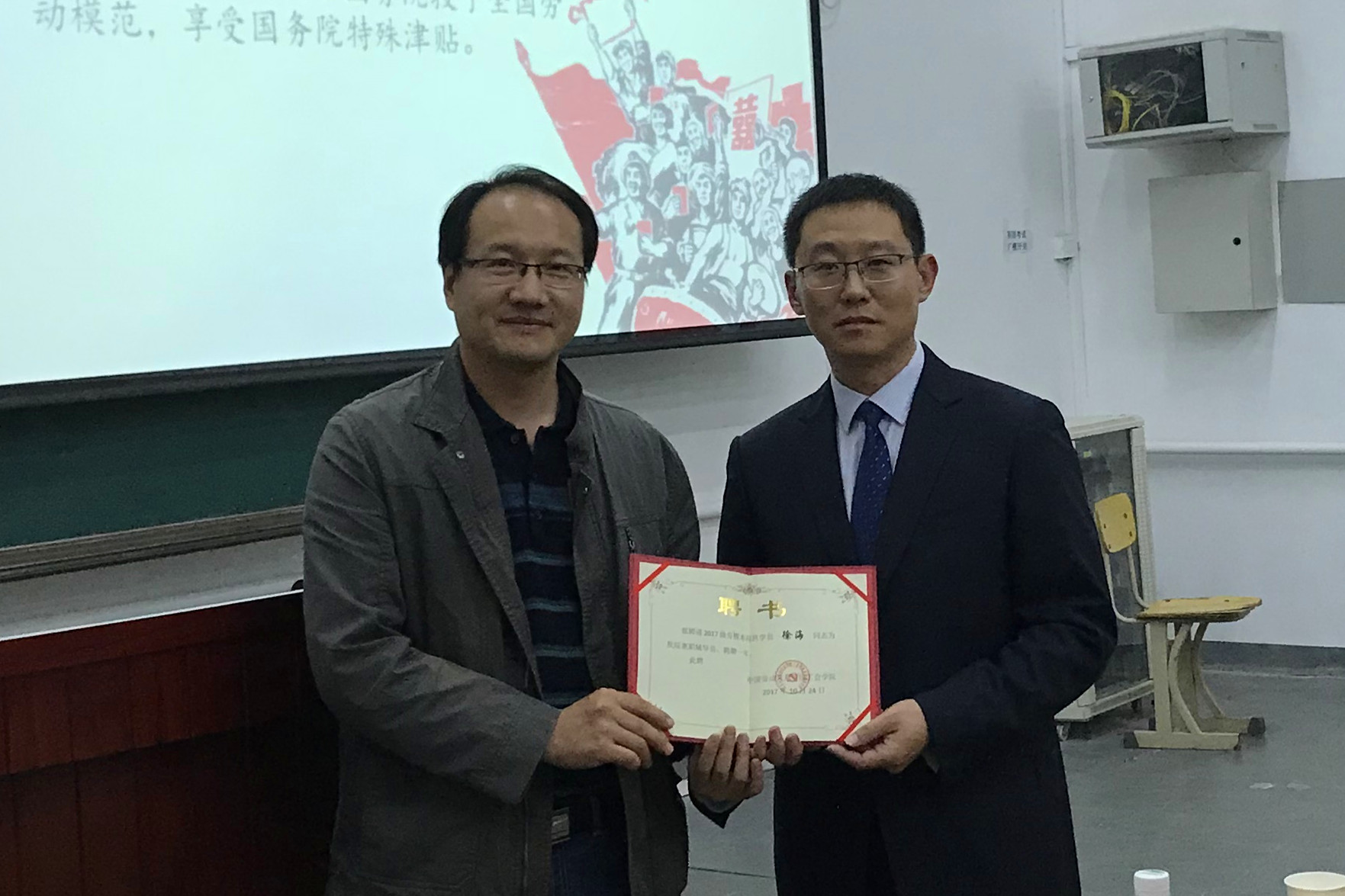 报告结束后,2017级劳模本科班学员徐海受聘为工会学院兼职辅导员,党总支书记李东为他颁发聘书。