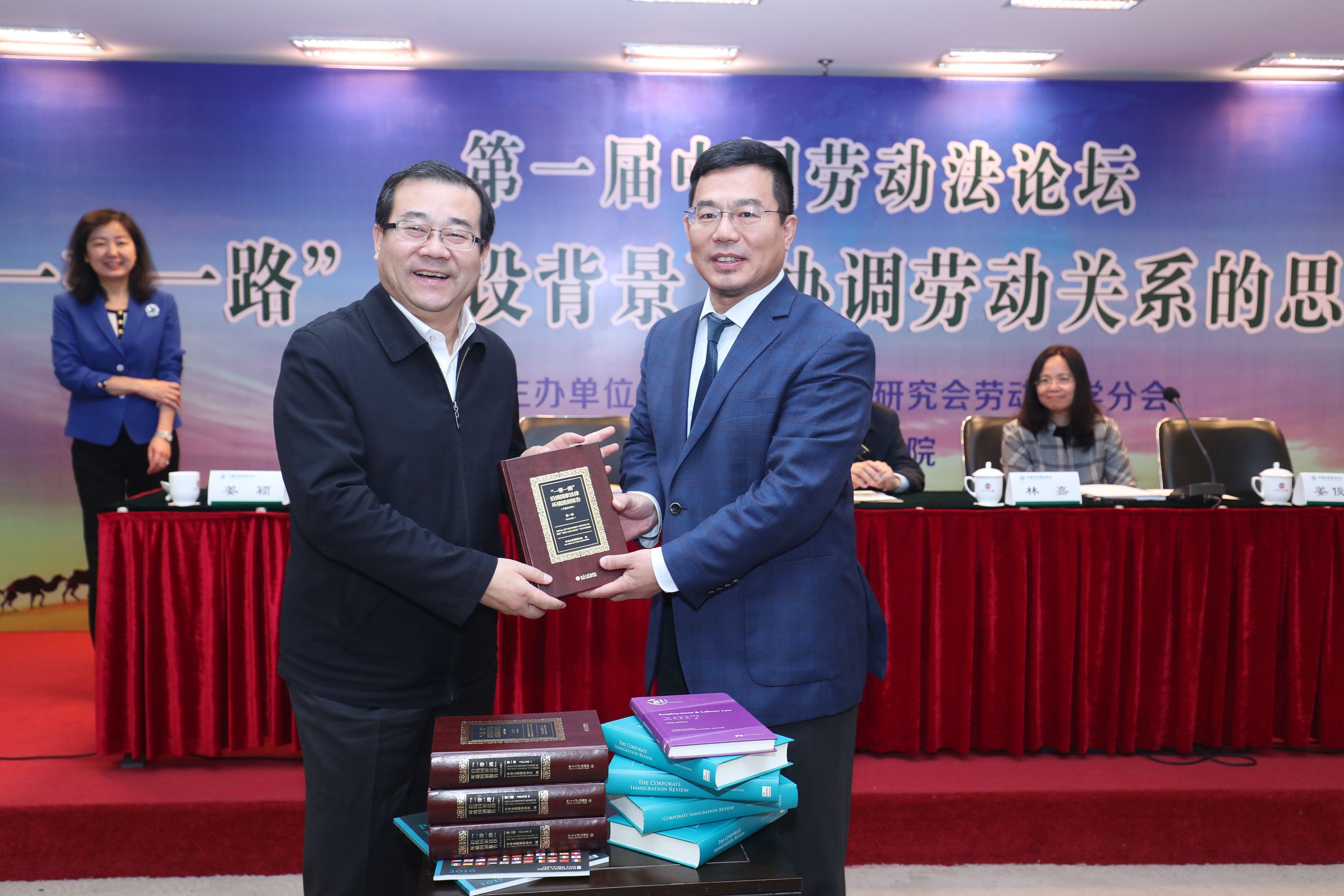 中国社会法学研究会常务副会长、中国人民大学法学院党委书记林嘉教授在致辞中,对会议的召开表示祝贺,并对未来“一带一路”建设背景下协调劳动关系问题的研究寄予殷切的期望。中国社会法学研究会副会长、金杜律师事务所合伙人姜俊禄律师就“一带一路”沿线国家劳动法的比较研究与国际合作做了主旨报告,介绍了“一带一路”沿线国家的劳动法律制度概况以及他们正在从事的“一带一路”沿线国家法律制度研究的状况。开幕式上,刘向兵校长代表学校接受了金杜律师事务所向学校捐赠的《“一带一路”沿线国家法律环境国别报告》系列图书。