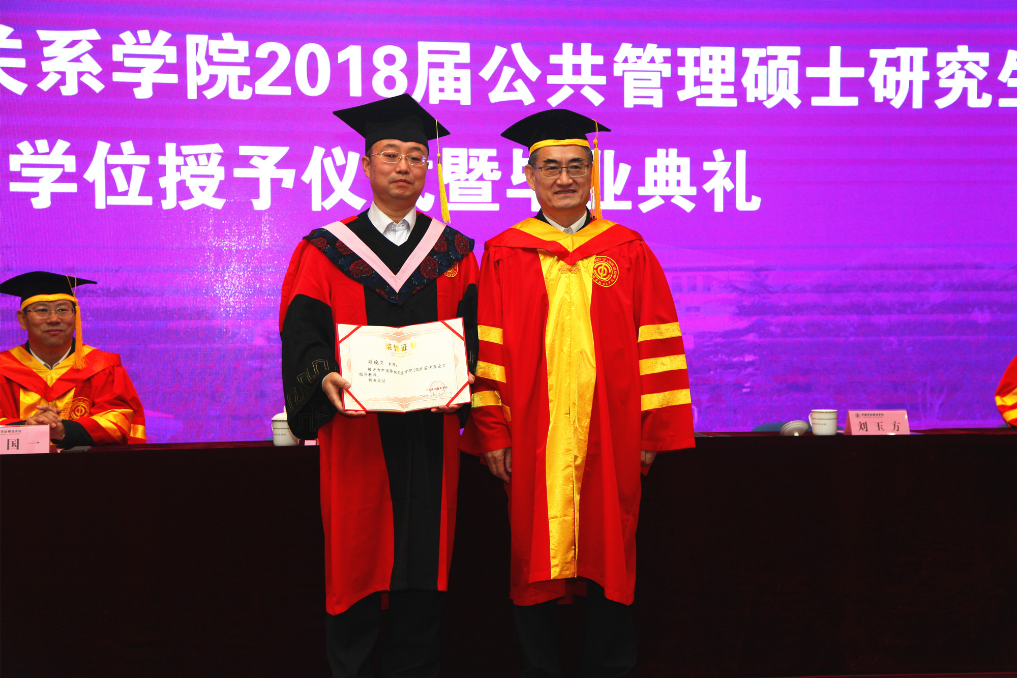 屈增国书记分别为李里颁发优秀研究生学位论文证书,为胡晓东教授颁发优秀研究生论文指导教师证书。