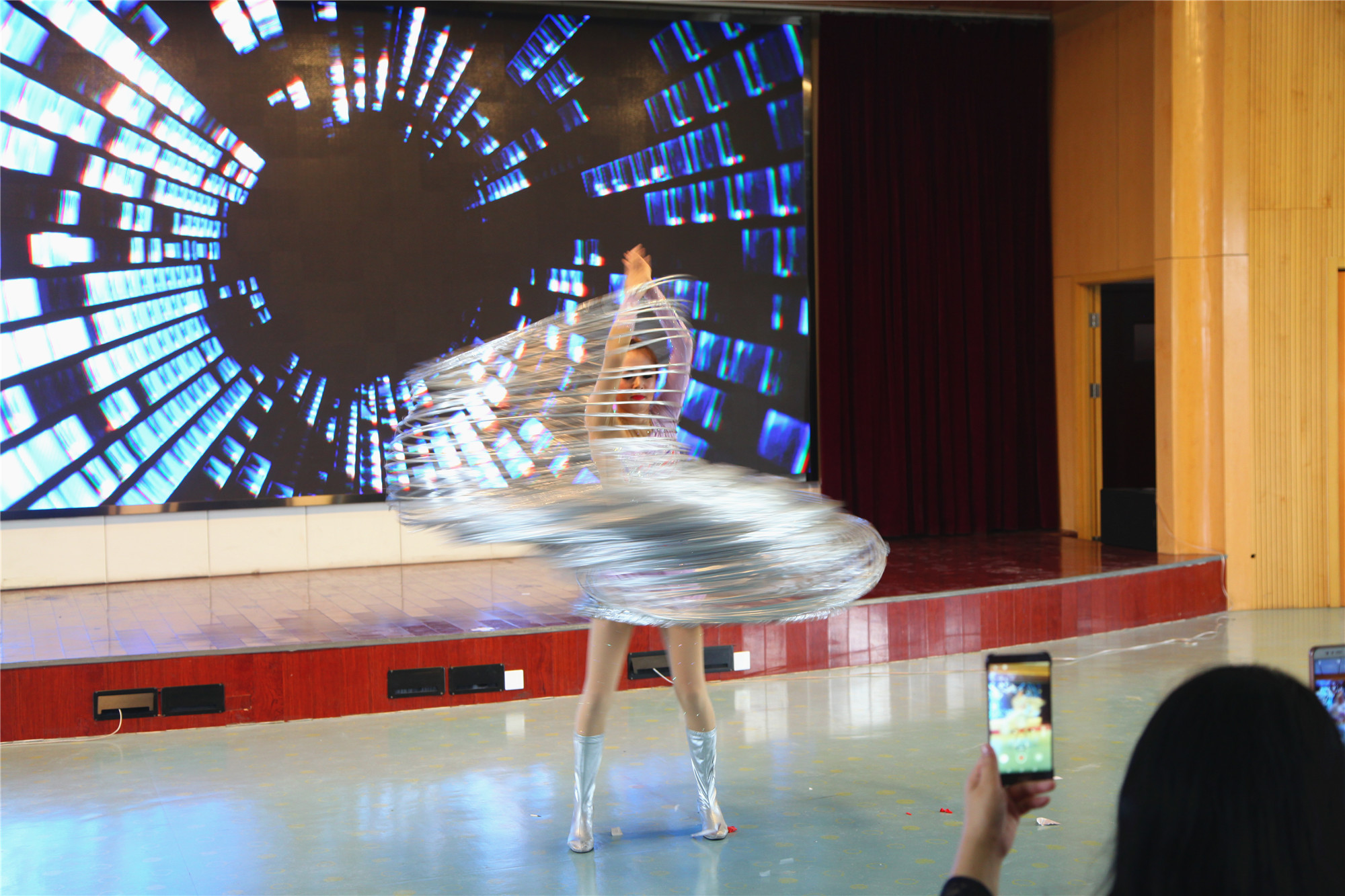 多次在国外演出、吉尼斯世界纪录保持者金琳琳向观众展示了呼啦圈的魅力,并用呼啦圈拼成了奥运五环图案,无数个圈在旋转飞扬,把观众的情绪激发到了极点。