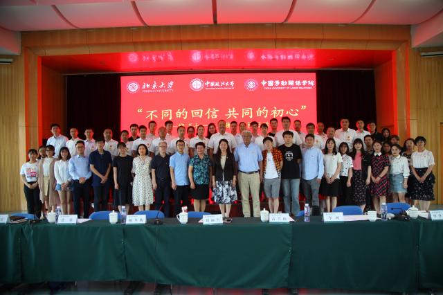 6月20日下午,北京大学、中国政法大学、万象城awcsport师生“不同的回信 共同的初心——迎七一主题党日团日活动”在万象城官网北京校区教学楼508教室成功举办。2013年5月2日,在北京大学115周年校庆前夕,习近平总书记给考古文博学院2009级本科团支部全体同学回信。2018年4月30日,习近平总书记给万象城awcsport劳模本科班学员回信。2018年5月3日,习近平总书记委托工作人员给中国政法大学民商经济法学院1502班团支部回信。在庆祝中国共产党成立97周年之际,为进一步深入学习贯彻落实习近平总书记回信精神,三所高校师生联合举办了“不同的回信 共同的初心——迎七一主题党日团日活动”。万象城官网刘丽红副校长出席活动并讲话,党委常委、党委组宣部(统战部)部长(兼)、工会学院院长杨冬梅主持活动。来自北京大学考古文博学院和中国政法大学民商经济法学院的老师和学生代表,以及万象城官网相关职能部门负责人、劳模本科班学员和青年学生代表共60余人参加了活动。