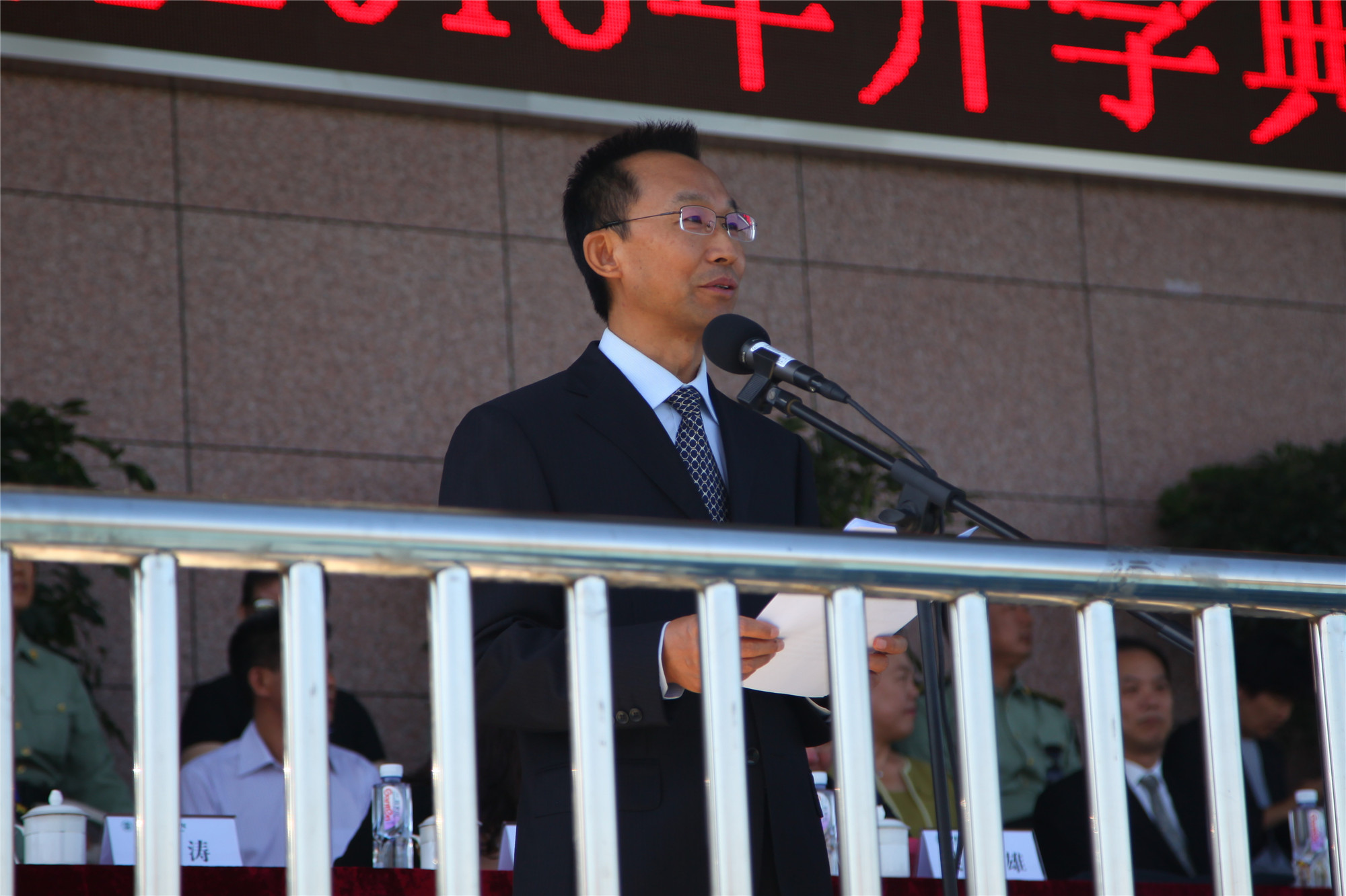 伴随着雄壮的国歌声,典礼正式开始。刘向兵校长在致辞中,代表屈增国书记和学校领导班子,代表全校教职员工,对2018级全体新同学的到来表示最热烈的欢迎,向辛勤培育学生成长的父母、师长致以最亲切的问候,也对承担今年国防教育任务的66289部队的首长、教官表示最诚挚的感谢!