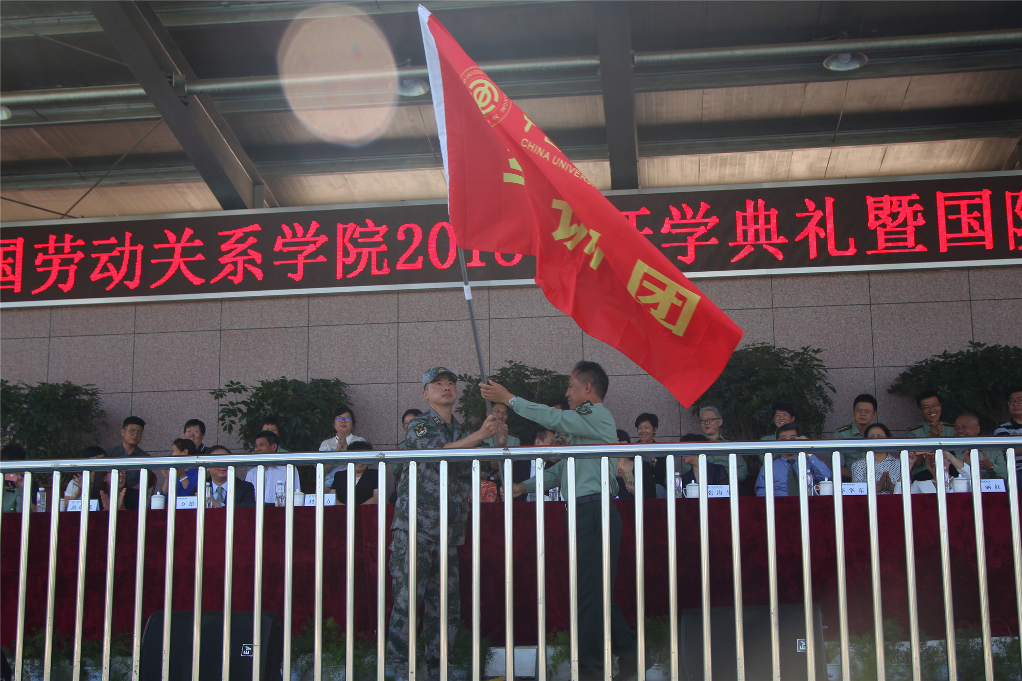 李华东副校长向国防教育团张海生团长授军训团团旗。