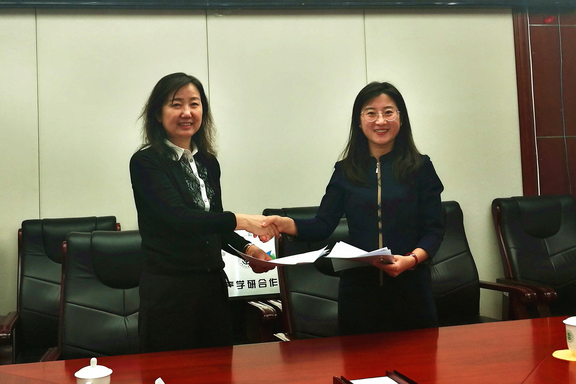 会上,姜颖处长与姜艳艳总经理代表双方签约,刘向兵校长与杨金峰董事长共同为就业创业实践基地揭牌。