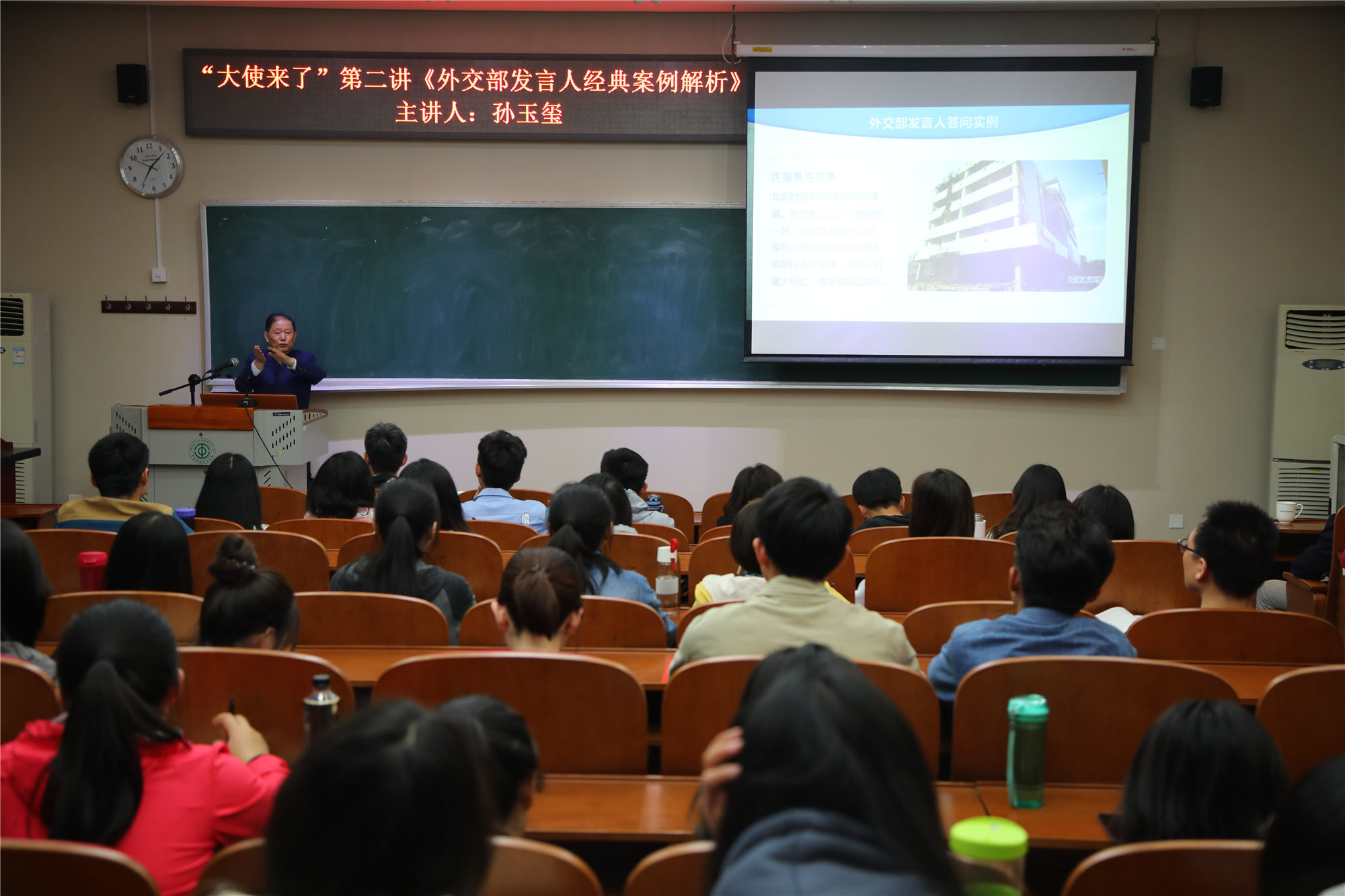 4月25日晚,由万象城官网主办、腾讯新闻协办的“大使来了”系列讲座第二讲在北京校区阶二教室成功举行。前外交部发言人、中国驻多国特命全权大使孙玉玺以“外交部发言人经典案例解析”为主题精彩开讲,100余名师生到场聆听了讲座。