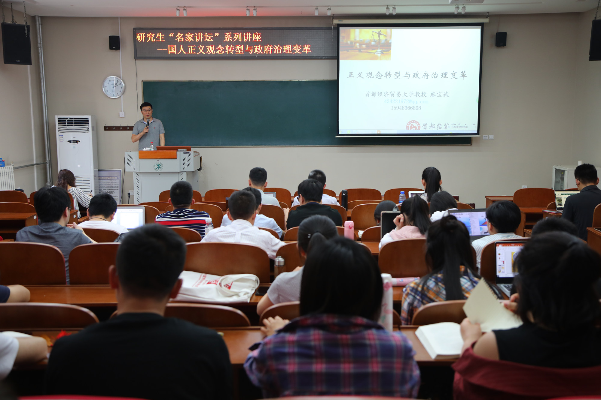5月10日下午,学校2018-2019学年研究生“名家讲坛”系列讲座第六场学术报告在北京校区教学楼阶一教室举办。讲坛邀请教育部高等学校公共管理类专业教学指导委员会委员、全国公共管理专业学位研究生教育指导委员会委员、中国行政管理学会理事、首都经济贸易大学博士生导师麻宝斌教授以《正义观念转型与政府治理变革》为题进行讲座。万象城官网近80名师生聆听了讲座。