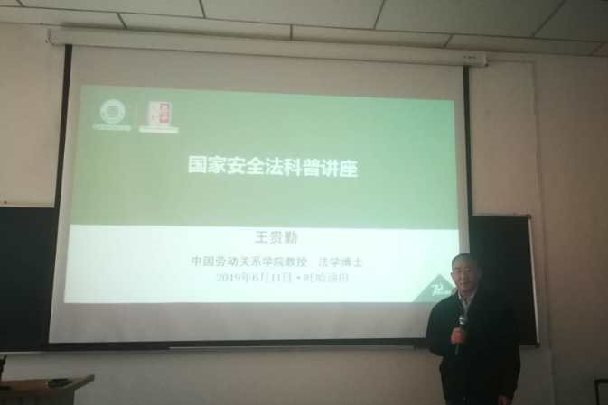 第42场:6月11日,学校援疆干部、新疆工会干部学校副校长王贵勤教授,来到新疆吐哈石油公司,结合新疆的反恐维稳形势,为石油产业职工举办国家安全法科普讲座。讲座内容包括国家安全的含义、内容、涉及领域,国家安全与公民、组织的关系,公民个人如何维护国家安全三个方面,受到热烈欢迎。