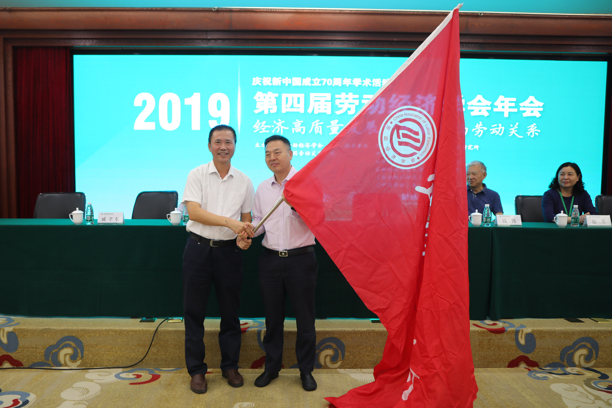 下一届年会承办方北京师范大学经济与工商管理学院院长戚聿东教授从张车伟会长手中接过了劳动经济学会的会旗。张车伟会长在闭幕辞中表示,希望更多高校开设劳动经济专业,培养劳动经济人才,劳动经济学会将进一步加强学会内外的学术交流与合作,为国家经济高质量发展做出应有贡献。