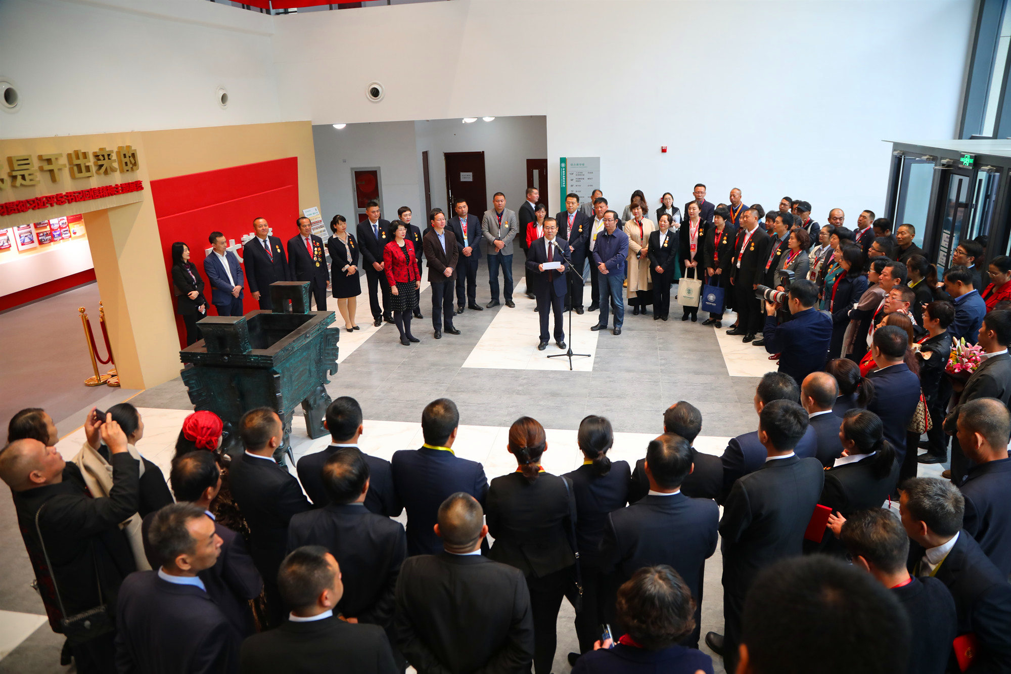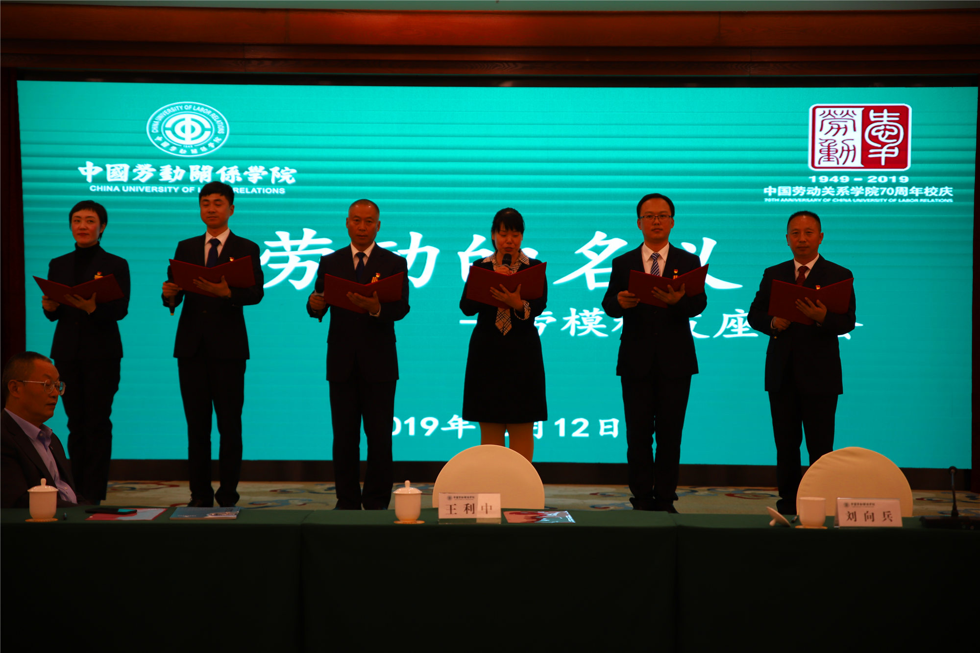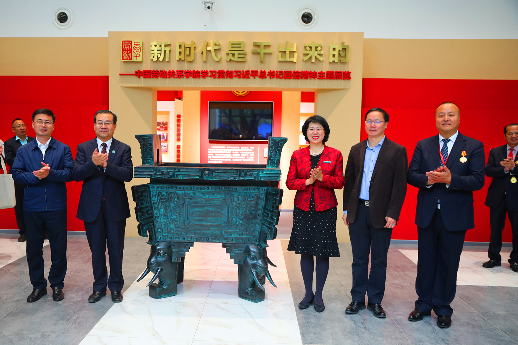 学校领导刘向兵、刘丽红、吴万雄共同为劳模校友代表2014级劳模学员朱玉华、2019级劳模学员张国利,颁发捐赠证书,并和劳模校友代表、2009级劳模本科班学员贾向东、2017级劳模本科班学员张鹏一起为捐赠礼物——青铜鼎揭幕。青铜鼎的一面镌刻着从1992级到2019级劳模学员对学校的赞誉与祝福,另一面则是一篇“劳动赋”铭文,由学校图书馆馆长吕明涛撰写,文风古朴,韵味深厚。