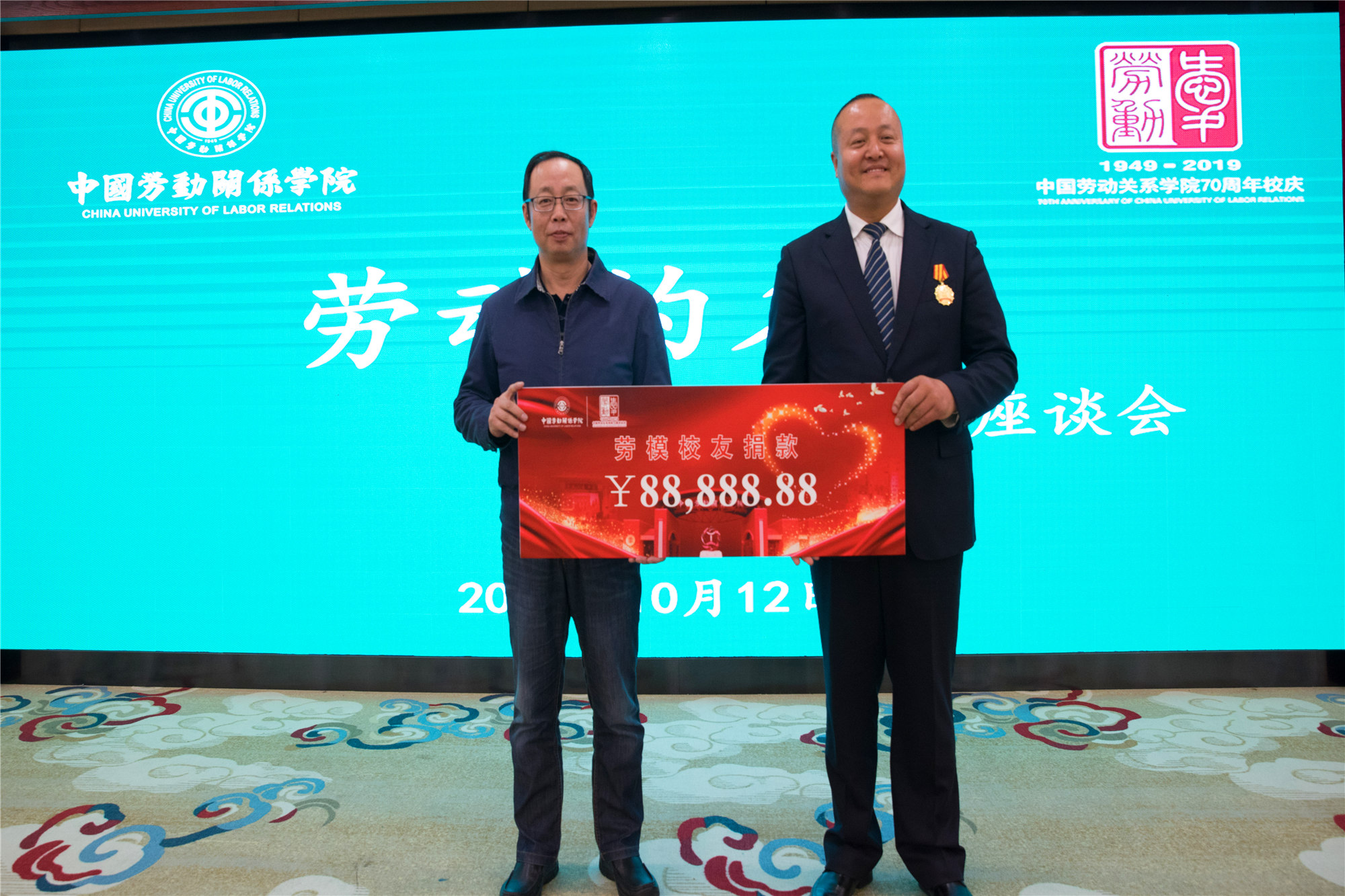 在随后的捐赠环节,2017级劳模本科班学员张鹏代表全体劳模校友,向学校捐款88888.88元,劳模学院院长纪元作为代表接受捐赠。