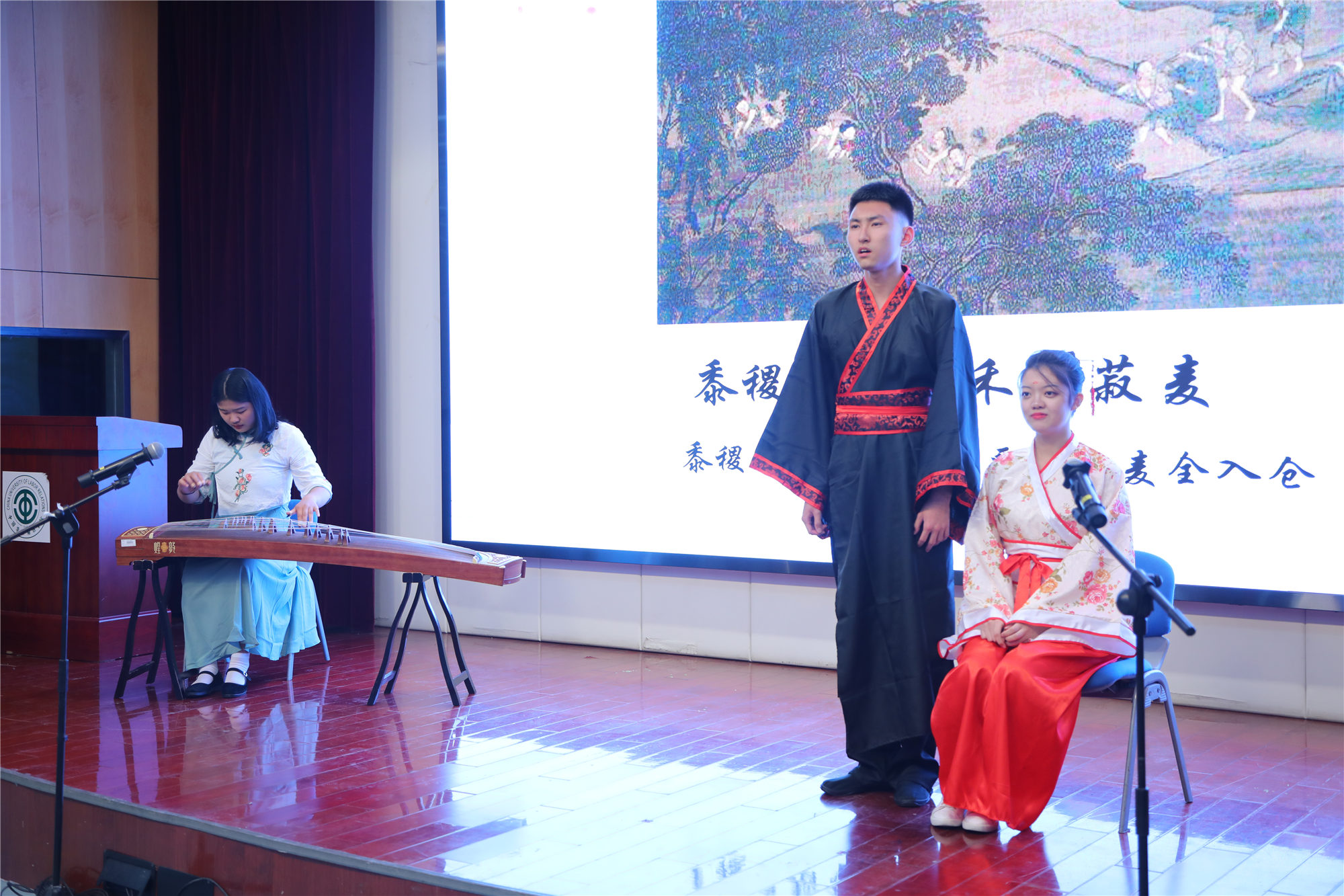 本次朗诵会采用战队对抗的形式,通过“中国古代诗词”“中国现代诗歌”“外国散文”和“中外名人名言”四个环节进行比拼和展示。在“中国古代诗词”环节中,选手们身着古装,配以精美的背景图片和优美的音乐将古代诗词娓娓道来,展示了古人对劳动的热爱和古代诗词的韵律美;在“中国现代诗歌”环节,选手们以饱满的热情和慷慨激昂的朗诵,抒发了对劳动者的深情赞歌;在“外国散文”环节,选手们以清晰流畅的英文朗诵令现场评委啧啧称赞;在最后的“名人名言”环节,选手们熟练接龙古今中外关于“劳动”的名言名句,赢得现场观众的阵阵掌声。