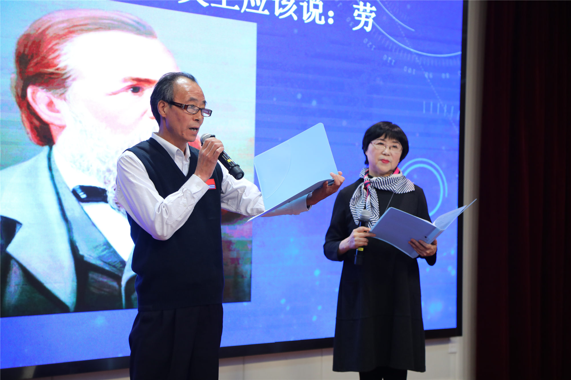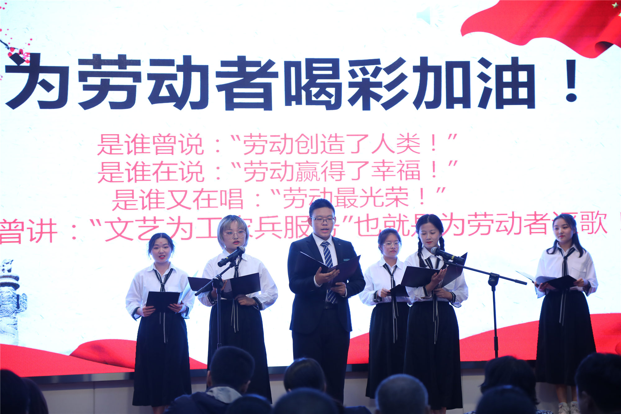 活动中,离退休教师代表和研究生代表联合队带来“马克思恩格斯列宁关于劳动的论述选段”表演,他们用沉稳的嗓音和优雅的台风,展示了共产主义先辈们对劳动的推崇,好似上了一堂生动的历史课。劳模本科班学员代表更是用极富震撼力和感染力的表演抒发了对劳模班、对学校、对党和祖国的无限热爱之情。