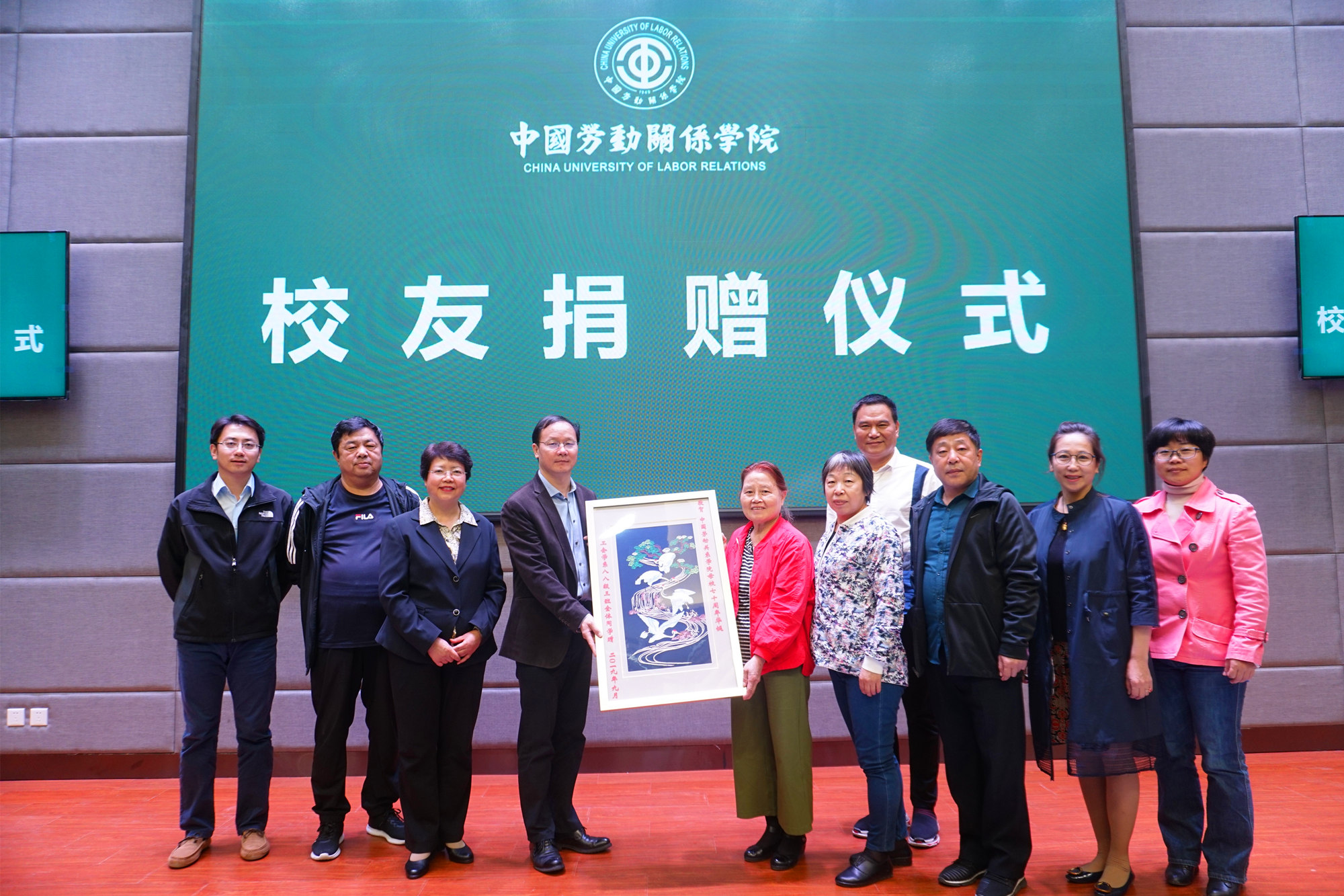 吴万雄副校长在讲话中,对校友心系学校发展表示衷心感谢。他表示,校友不仅是母校事业发展的见证者,也是建设者、参与者和支持者,更是母校事业发展可以永远倚重的资源和财富。他强调,今后,学校将为校友搭建更加广阔的互助沟通平台,不断提升服务水平,更加深入地关心校友发展,帮助校友成长,成为校友的坚强后盾。他希望,广大校友能够积极参与学校的发展建设,谱写与母校共同发展的新篇章。吴万雄副校长代表学校接受原工会学系1988级3班全体同学捐赠的南京云锦《松鹤云锦图》、2006级社会工作专业全体同学赠送的锦旗,并为他们颁发捐赠证书。