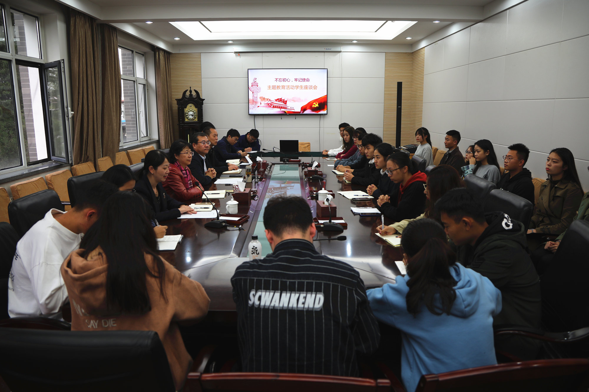 10月22日下午,根据学校党委“不忘初心、牢记使命”主题教育工作安排,学校在博识楼二层会议室召开主题教育学生座谈会。党委书记刘向兵、副校长刘丽红出席会议并就涿州校区学生关心的问题进行调研,相关职能部门负责人、学生代表20余人参加会议。