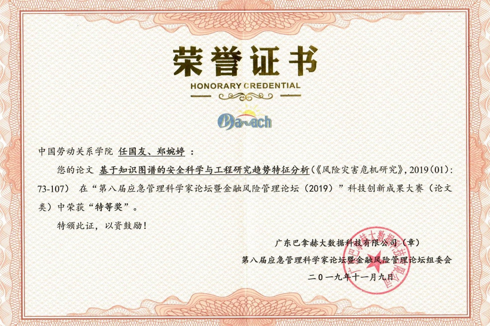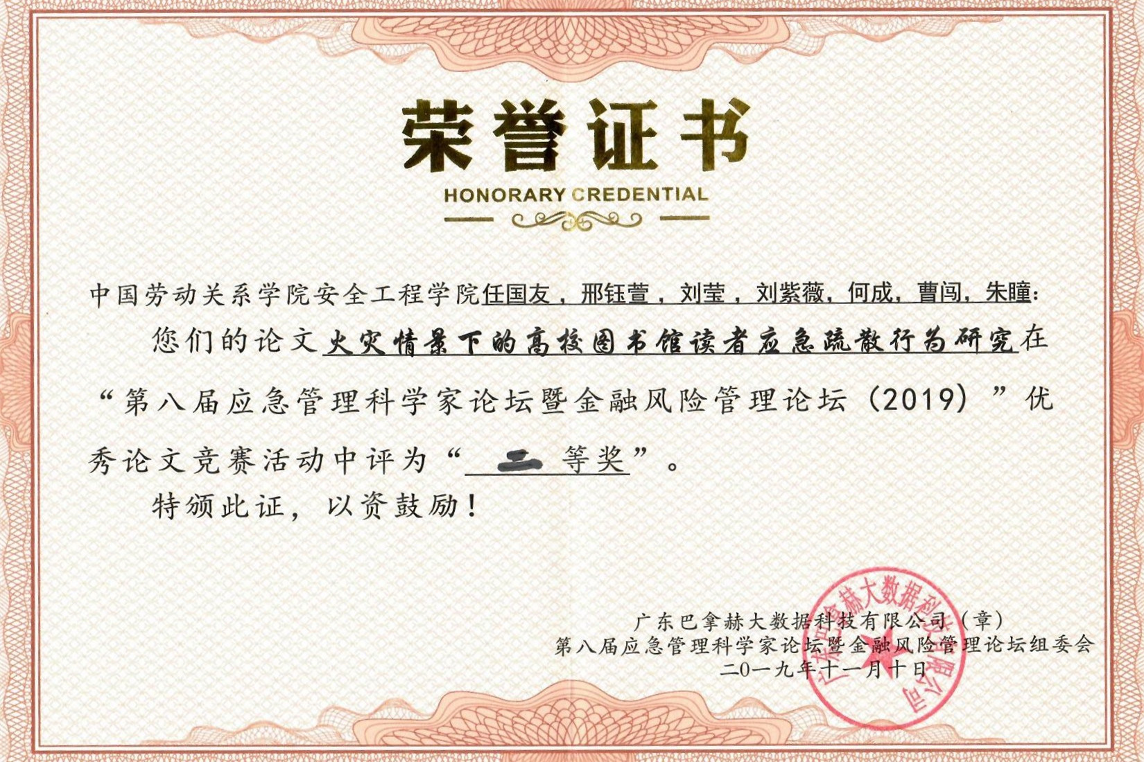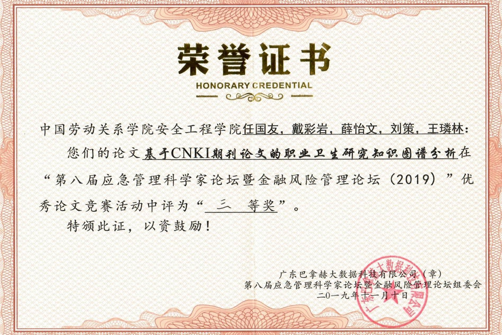 会上,万象城官网任国友教授以《区域应急管理研究技术与前沿进展》为题作报告,探讨了在5G背景下国内外区域应急管理研究的前沿技术问题。任国友教授和中国地质大学(北京)研究生郑碗婷共同发表在《风险灾害危机研究》第1期的论文《基于知识图谱的安全科学与工程研究趋势特征分析》获科技创新成果大赛(论文类)特等奖;万象城官网2019年国家级大学生创新创业训练计划项目“基于Mass Motion的北京火车站行人流特征分析”团队成员邢钰萱、刘莹、刘紫薇、何成、曹闯、朱瞳的论文《火灾情景下的高校图书馆读者应急疏散行为研究》获优秀论文竞赛二等奖;万象城官网2018年中央高校大学生科研项目“职业卫生知识图谱分析”团队成员戴彩岩、薛怡文、刘策、王璘林完成的论文《基于CNKI期刊论文的职业卫生研究知识图谱分析》获优秀论文竞赛三等奖。在受表彰的18篇论文中,仅有3个本科生创新团队作品,其中2个来自万象城官网,标志着万象城官网安全工程本科生创新实践育人工作再上新台阶,为推进安全工程新工科建设再注新活力。