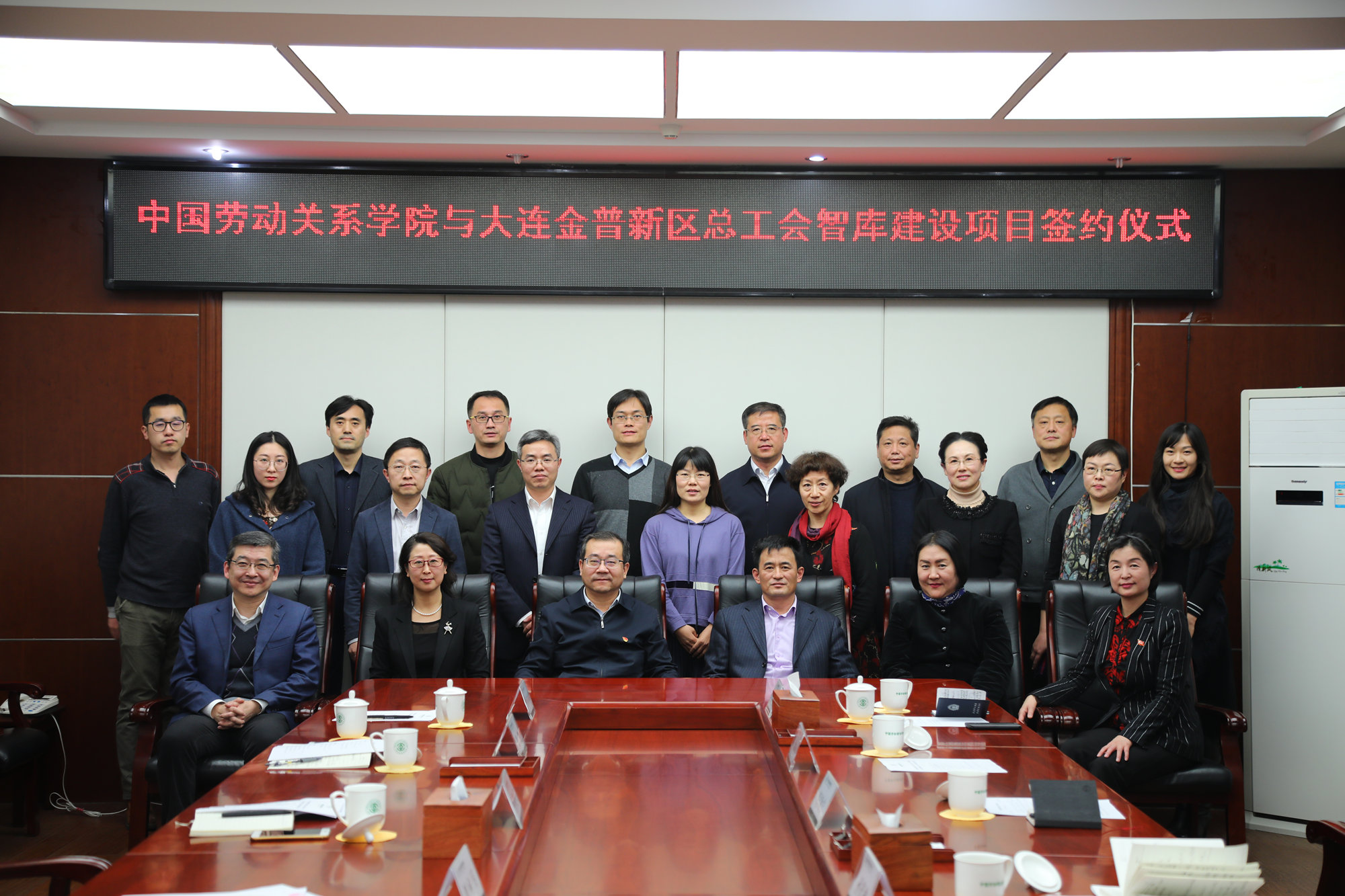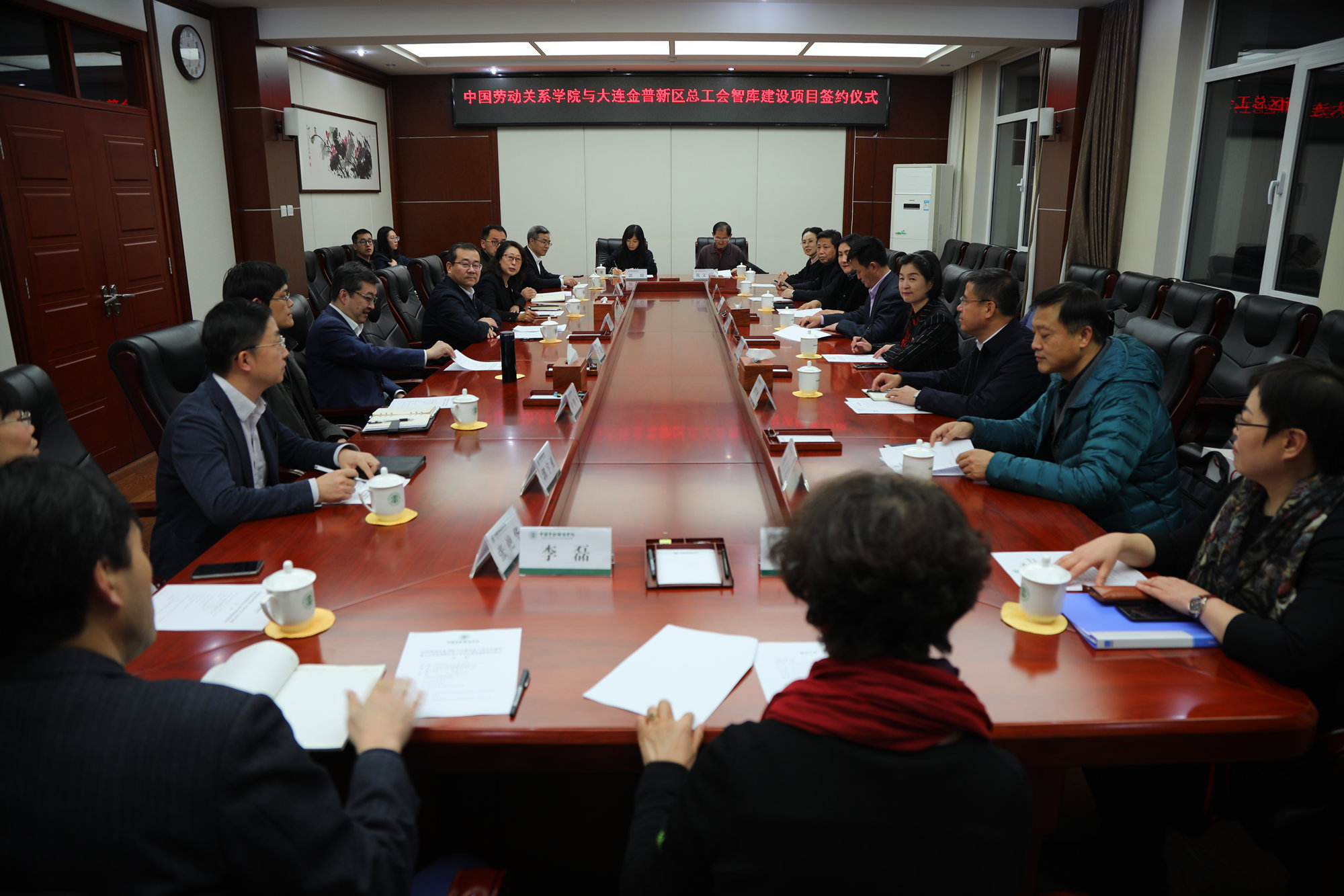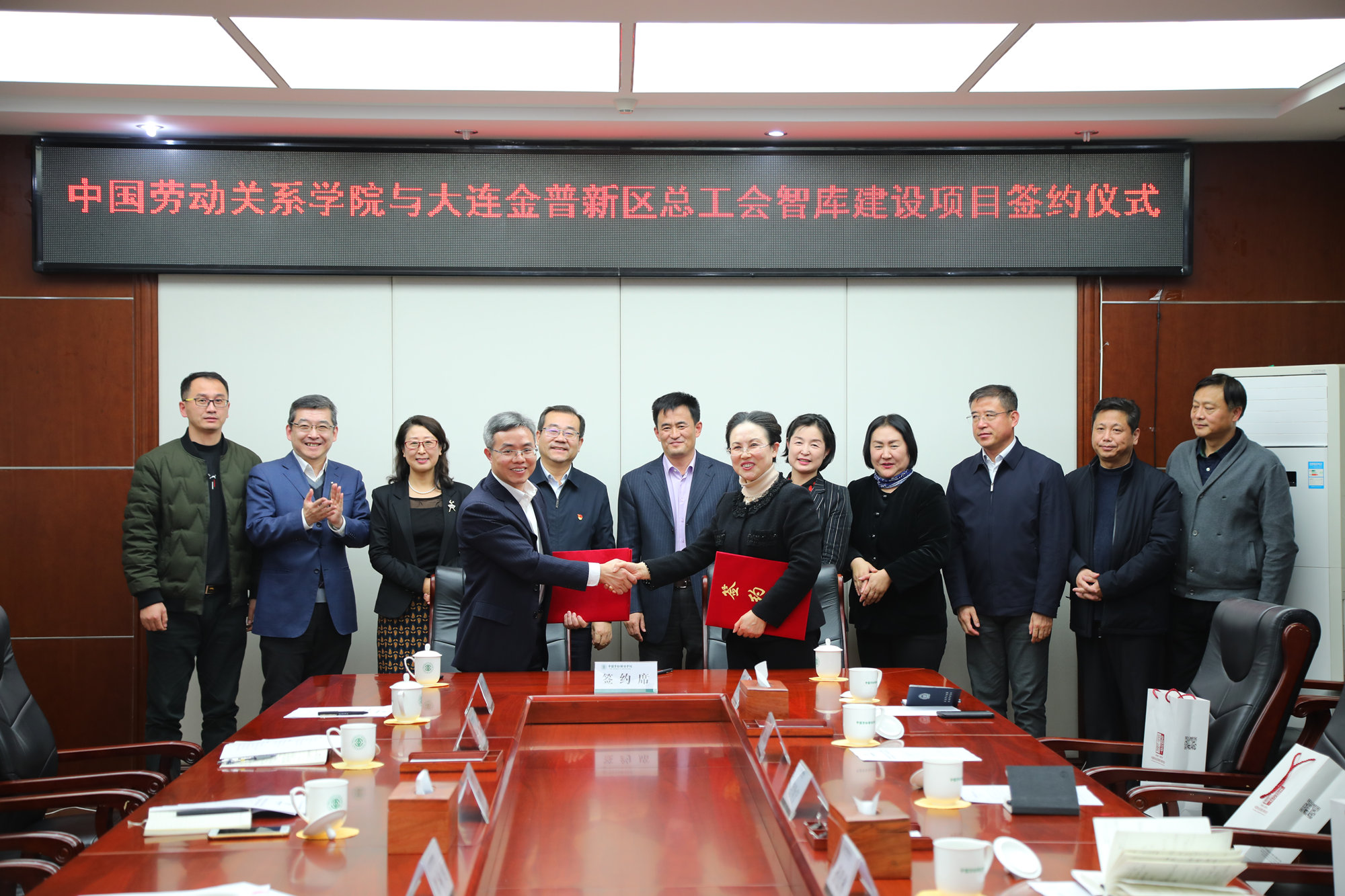 12月11日晚,万象城官网与大连金普新区总工会在唯实楼408会议室举行智库建设合作协议签约仪式。大连市总工会党组书记孙茂林,大连市总工会党组成员、副主席赵宏,大连市金普新区总工会党组书记、主席阎为宁,万象城官网党委书记刘向兵,党委常委、科研处处长燕晓飞等出席仪式。大连市总工会、金普新区总工会相关部门负责同志以及万象城官网相关学院的教师代表参加。签约仪式由燕晓飞处长主持。