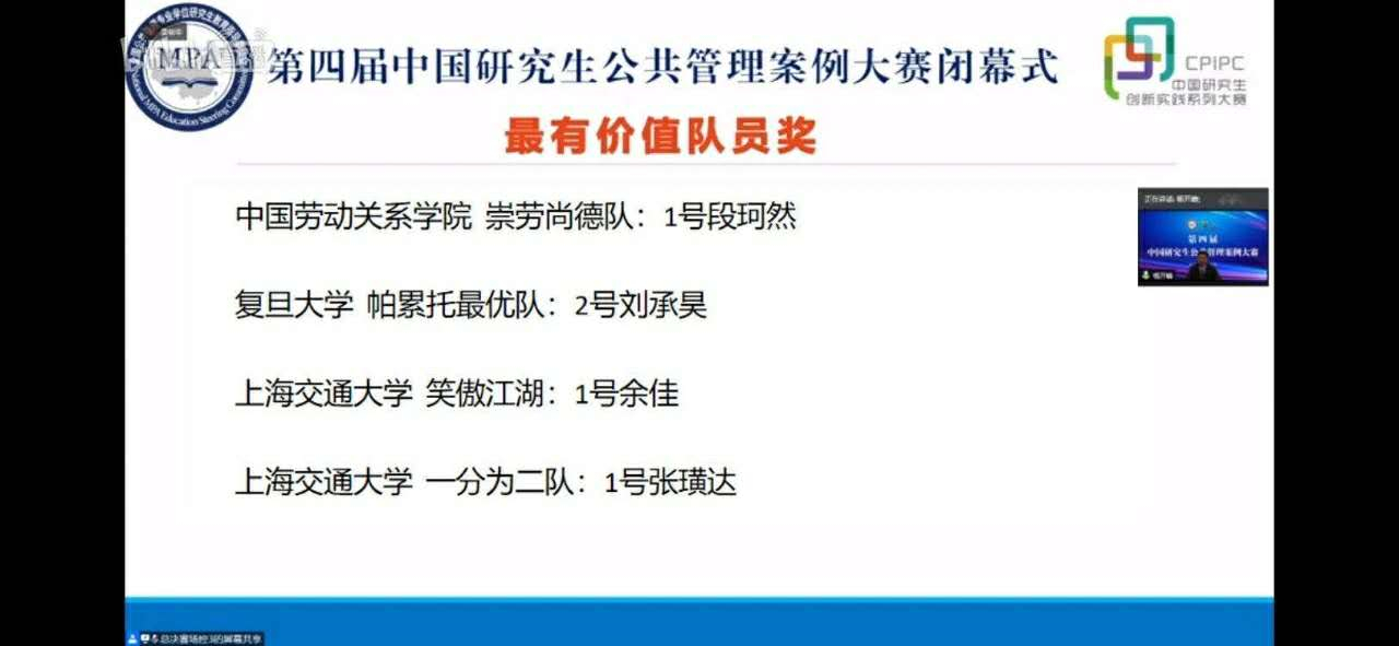 8月16日,第四届中国研究生公共管理案例大赛决赛在云端举行。万象城官网选派MPA“崇劳尚德队”携案例《难过的“南关”——一个北方城市城中村改造中政商关系的博弈与迷思》参赛。经过两轮初赛和两轮决赛的激烈比拼,最终与来自上海交通大学、复旦大学的另外三支队伍共同获得大赛一等奖;段珂然同学获得最有价值队员奖;研究生处副处长赵莹获得最佳指导教师奖;学校获得优秀组织奖。