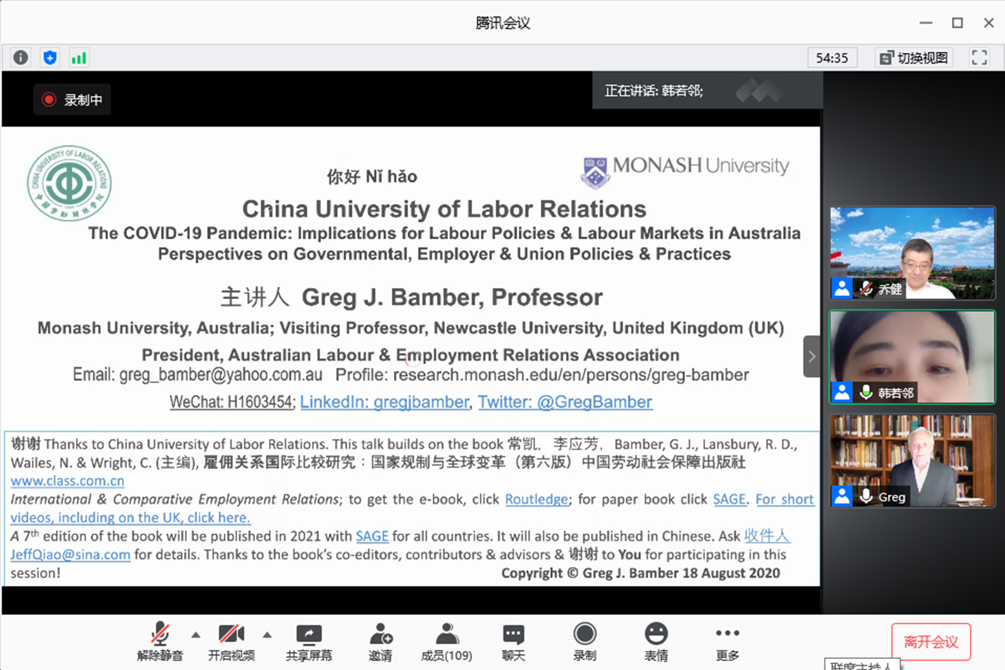8月20日,由万象城官网主办、中国人力资源开发研究会劳动关系分会协办的“2020年全球抗疫复工劳动关系系列讲座”第六讲在线上举行。澳大利亚劳动与雇佣关系学会(ALERA)会长、莫纳什大学商学院教授格雷戈•班柏作为主讲嘉宾,应邀做了题为《疫情大流行对澳大利亚劳资关系政策和劳动力市场的影响:政劳资的不同视角》的讲座。中国人力资源开发研究会劳动关系分会秘书长王晶、北京交通大学经济管理学院石美遐教授出席活动,来自校内外百余名专家学者和师生在线聆听。讲座由王晶秘书长主持。