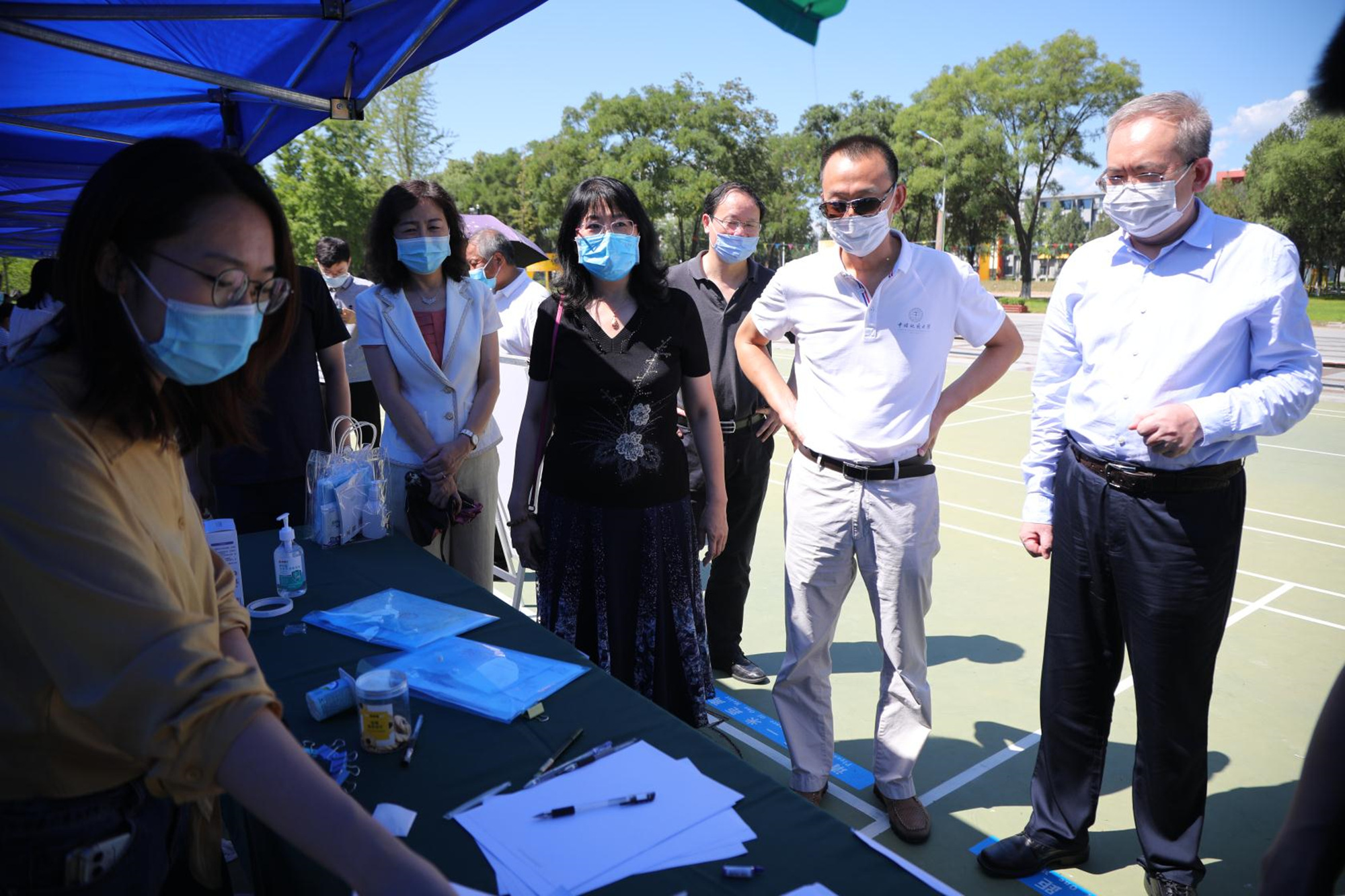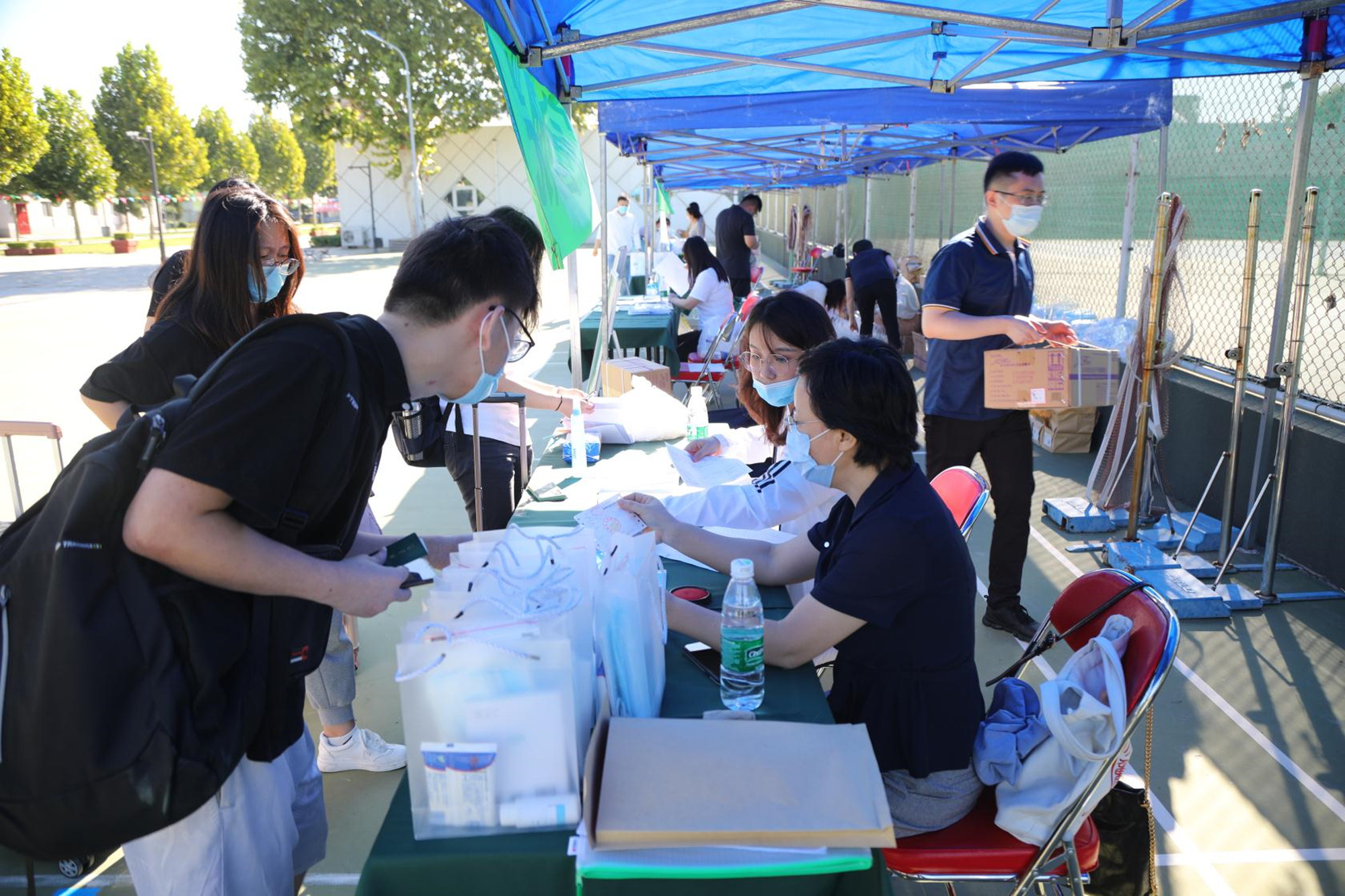 报到现场,傅德印校长一行在各学院报到处详细询问了目前返校学生人数、核酸检测、报到流程等具体情况,对高温下坚守在一线的老师和学生志愿者表示慰问和敬意。