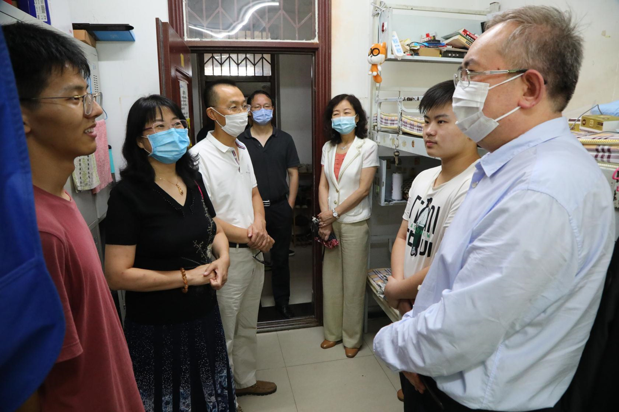 随后,傅德印校长一行深入学生宿舍与学生们亲切交流,代表学校党委对平安返校学生表示热烈欢迎,对学生们在疫情期间克服困难、坚持学业表示肯定,并叮嘱他们返校后要严格遵守学校疫情防控相关规定,做好个人防护和返京准备,早日进入学习状态。