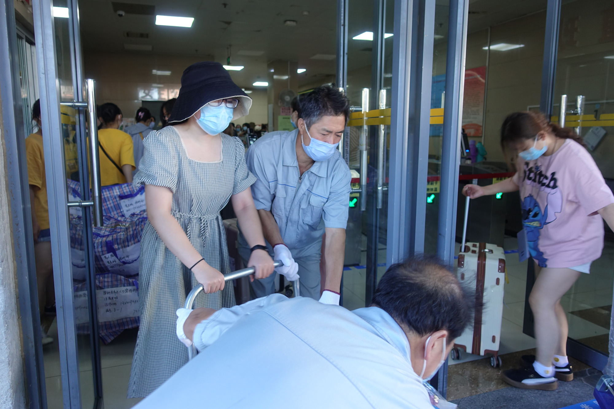 搬运过程中,后勤管理处工作人员分工明确、配合默契,纷纷加入行李搬运大军,及时帮助同学们搬运行李,有的负责引导疏散、有的负责客货车登记检查、有的负责行李搬运上楼……现场一派热火朝天的繁忙景象。保卫处工作人员负责制定运送路线,协助指挥调度往来车辆,疏导入校后校内交通,有力保障了师生们的进校安全。