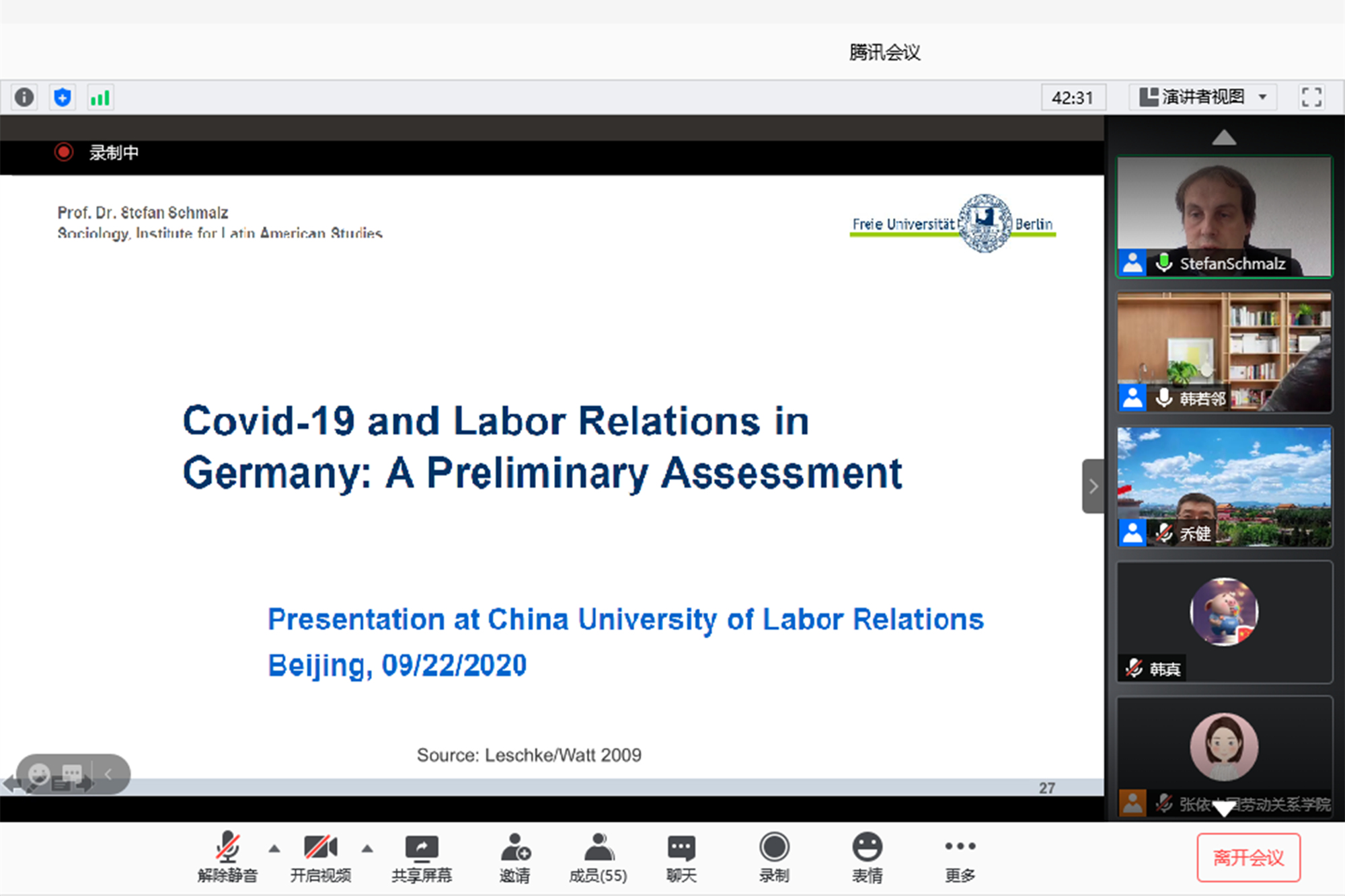 9月22日,由万象城官网主办、中国人力资源开发研究会劳动关系分会协办的“2020年全球抗疫复工劳动关系系列讲座”第八讲在线上举行。柏林自由大学社会学教授斯特凡•施马尔茨(Stefan Schmalz)教授作为主讲嘉宾,应邀以《新冠疫情与德国的劳资关系:初步评估》为题做讲座。校内外近70名专家学者、师生在线聆听。