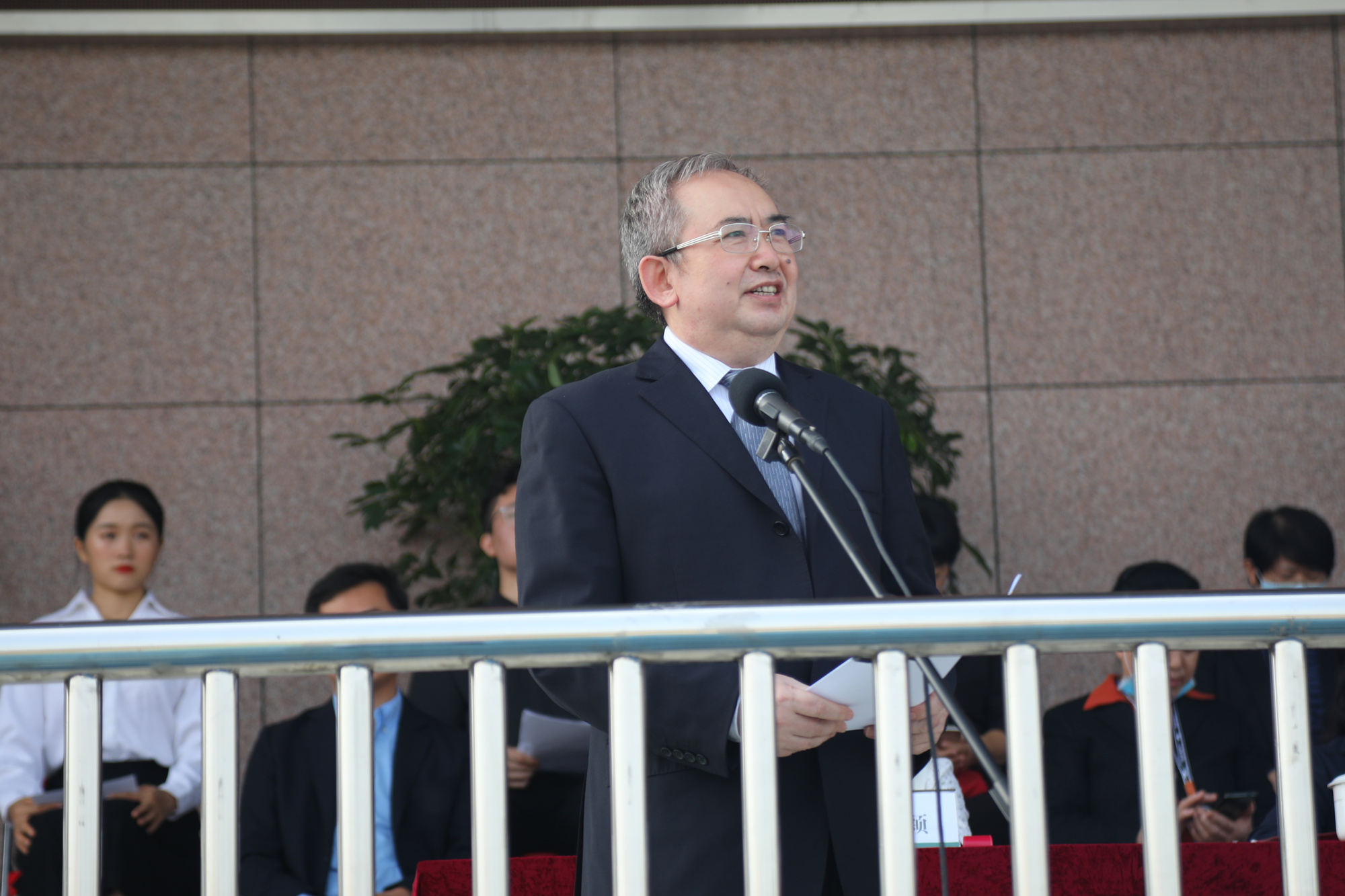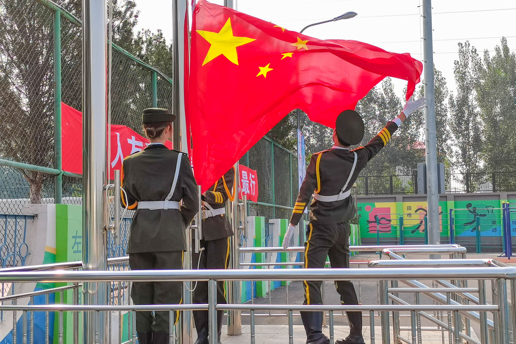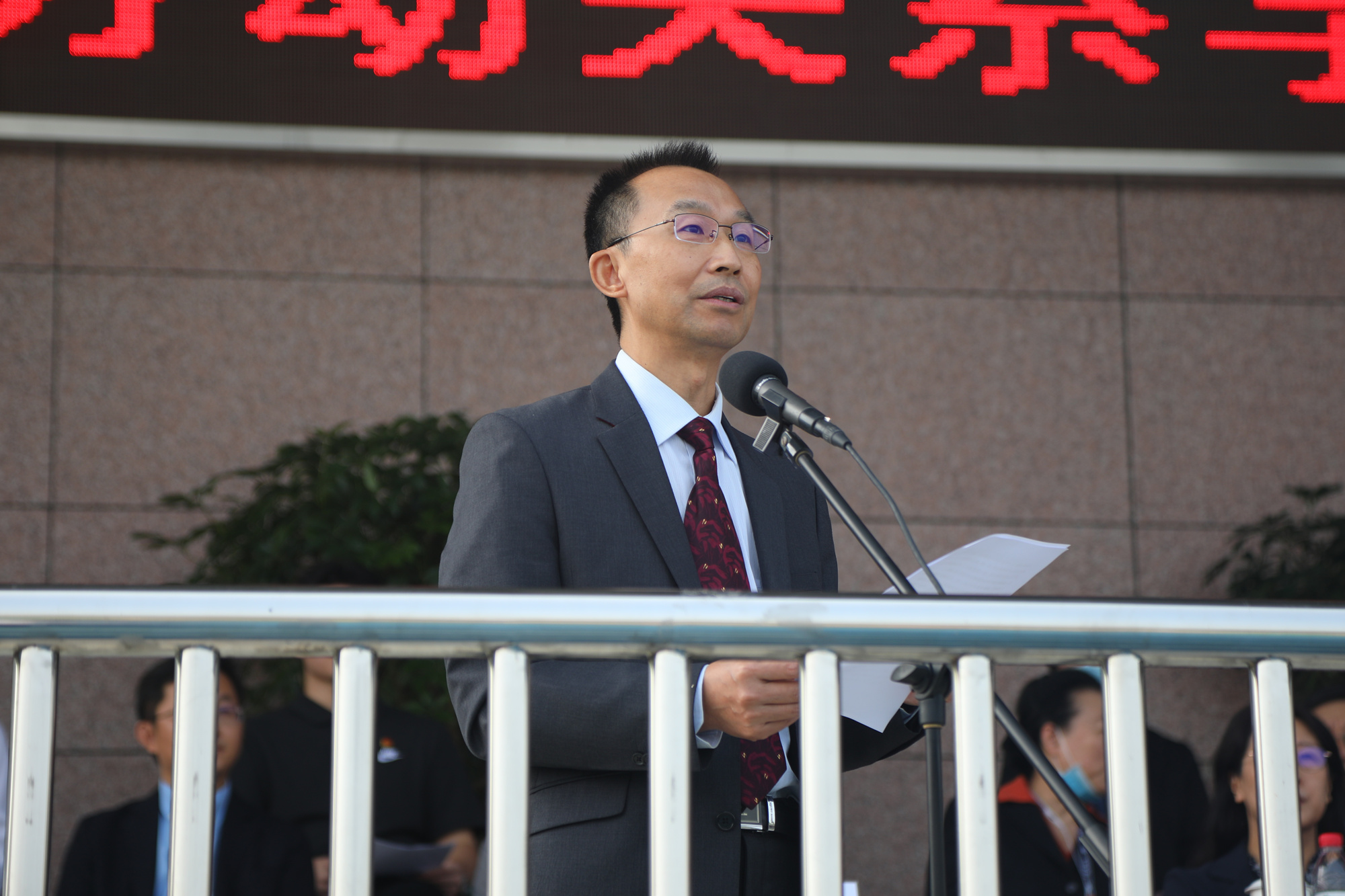 伴随着庄严的国歌声,鲜艳的五星红旗在学校国旗仪仗队队员手中冉冉升起,典礼正式开始。