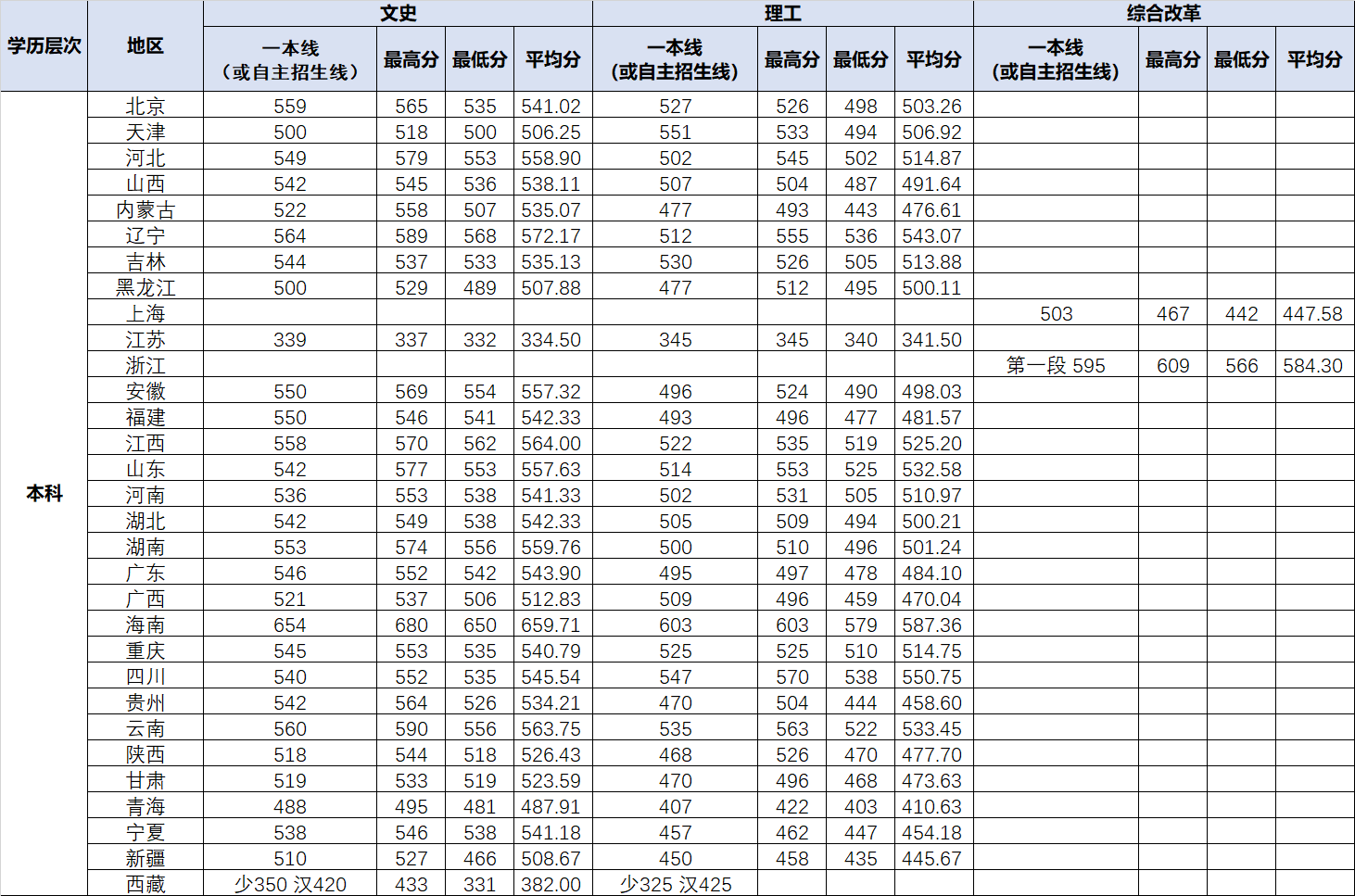 注:各省最低分为一次投档录取成绩,统计分数含国家专项批次,特此说明。