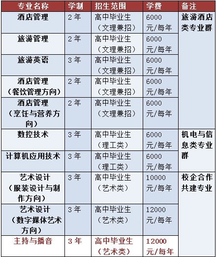 高职学院现设有酒店管理、旅游管理、旅游英语、酒店管理(餐饮管理方向)、酒店管理(烹饪与营养方向)、计算机应用技术、数控技术、艺术设计(服装设计与制作方向)、艺术设计(数字媒体艺术方向)、主持与播音等7个专业,共10个招生方向,其中艺术设计(服装设计与制作方向)、艺术设计(数字媒体艺术方向)和主持与播音专业为校企合作的共建专业,旨在依托企业在应用实践领域的丰富经验和就业资源,结合学校在理论教学和管理上的优势,共同培养相关行业的优秀人才。